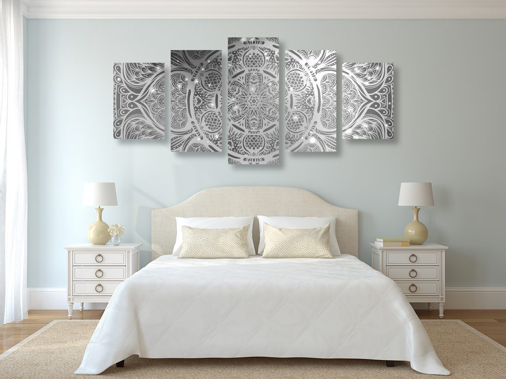 5-dílný obraz luxusní květ s perlami v černobílém provedení