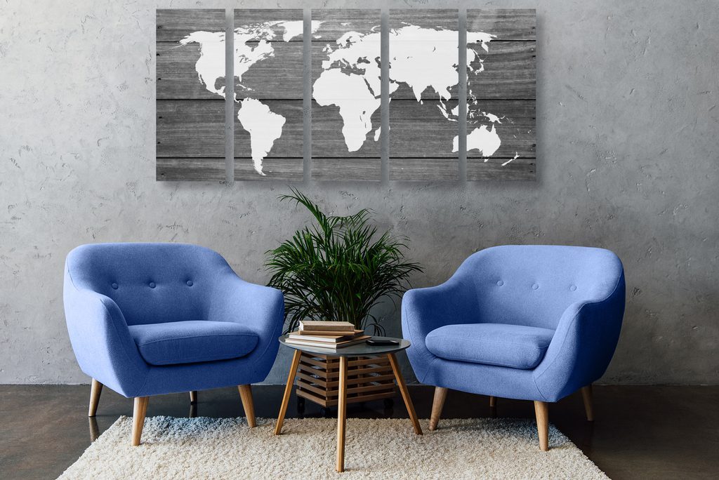 5-dílný obraz černobílá moderní mapa světa na dřevěném podkladu