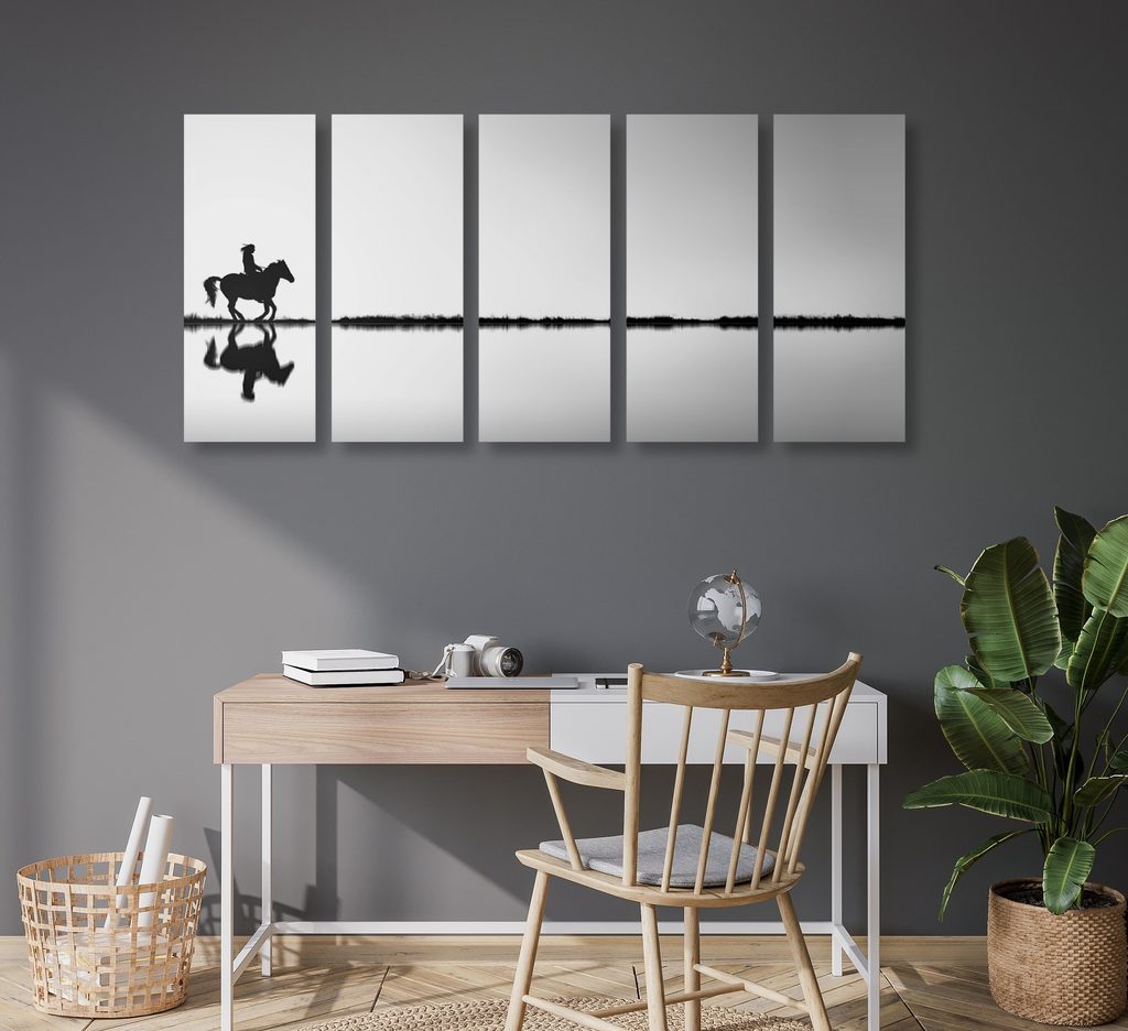 5-dílný obraz jízda za západem slunce v černobílém provedení