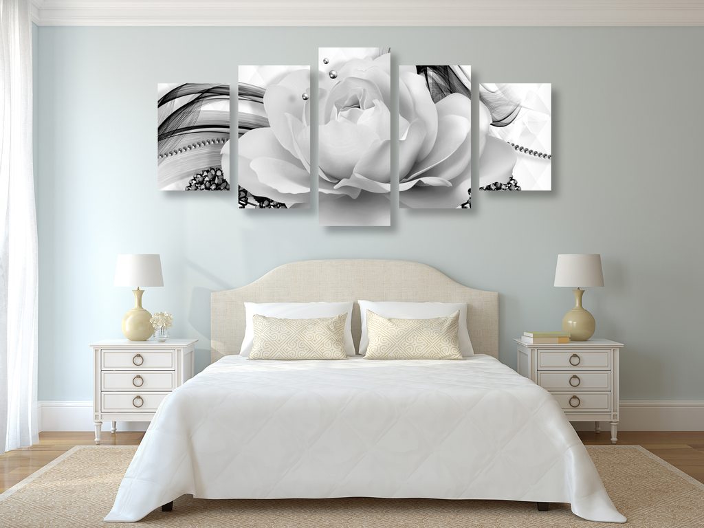 5-dílný obraz luxusní květ s perlami v černobílém provedení
