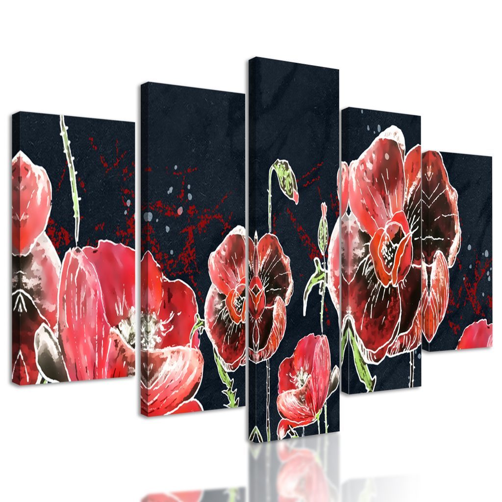 5-dílný obraz malované vlčí máky na tmavém pozadí