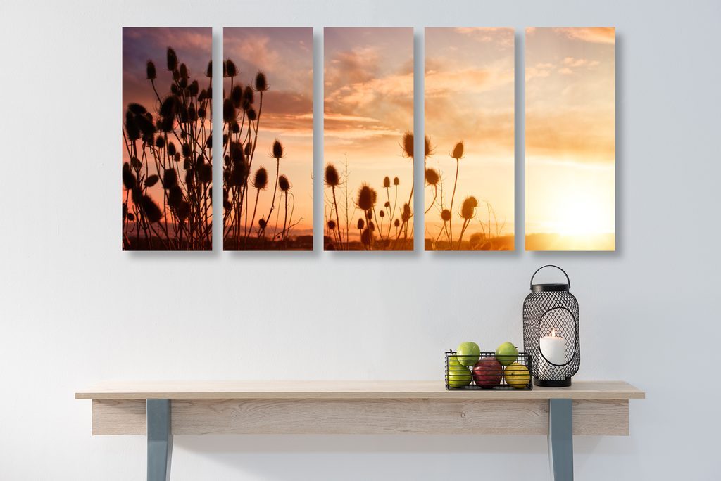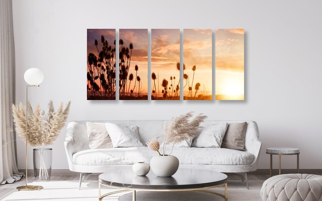 5-dílný obraz nádherný západ slunce za stéblami trávy