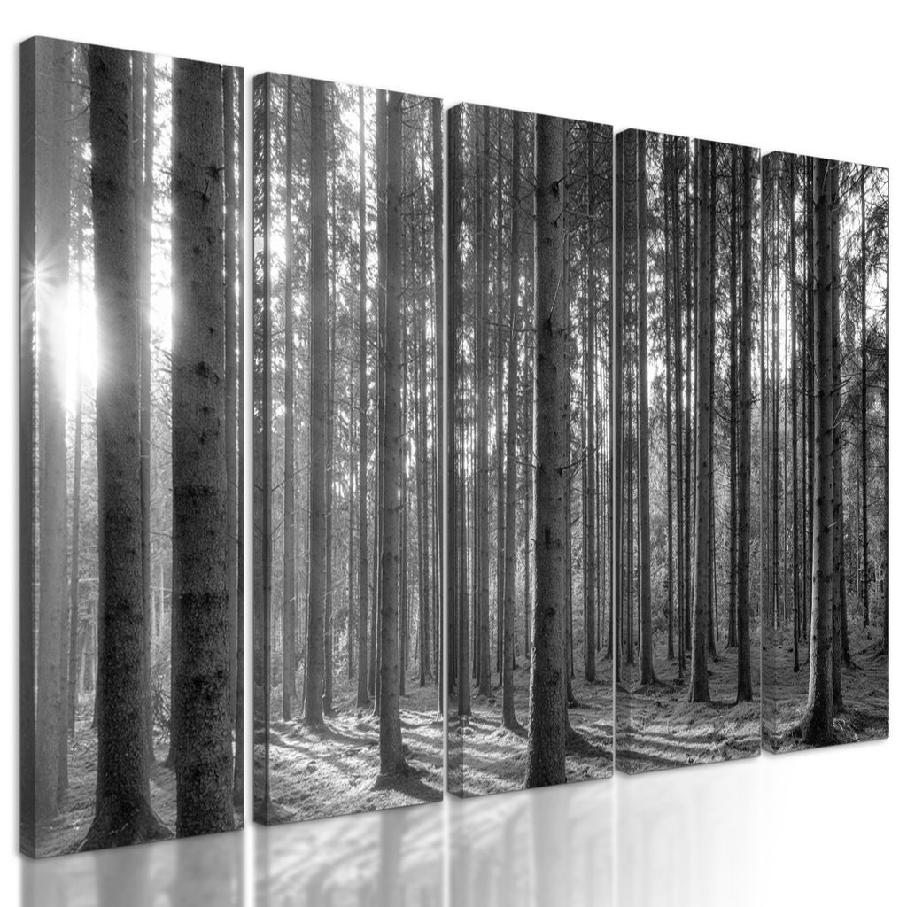 5-dílný obraz paprsky slunce mezi stromy v černobílém provedení