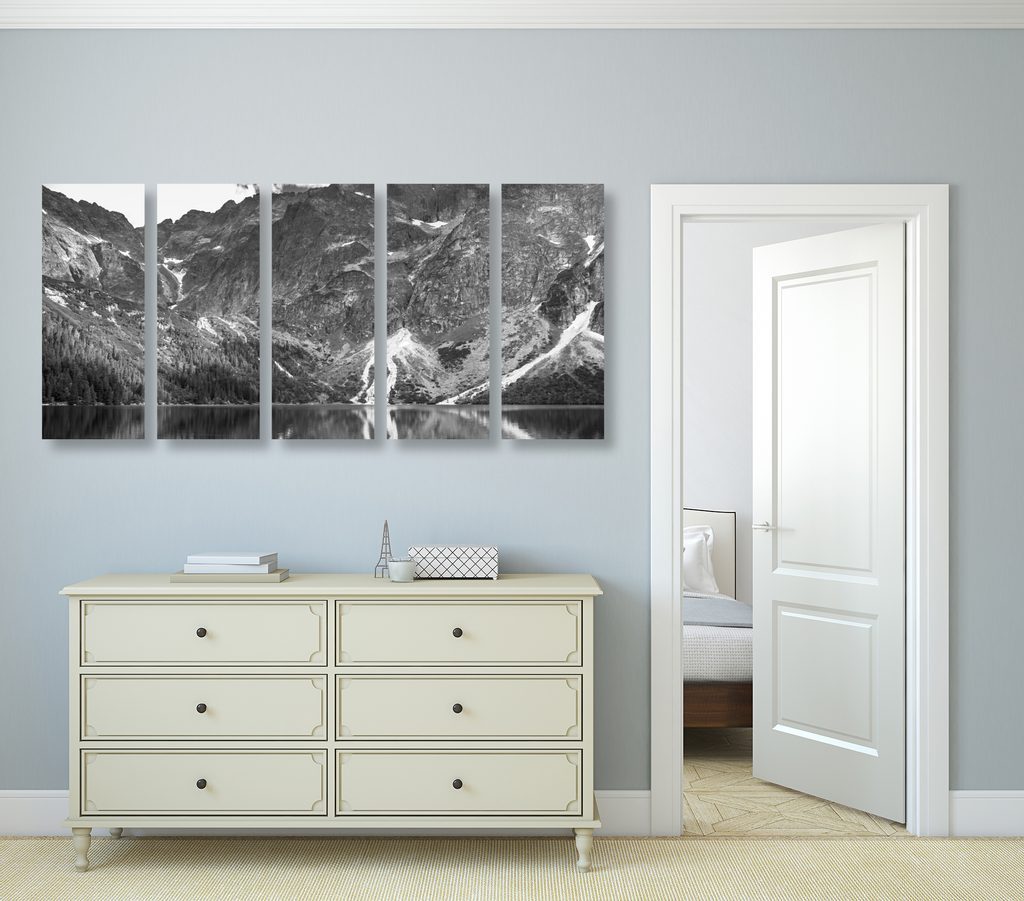 5-dílný obraz pleso v Tatrách v černobílém provedení