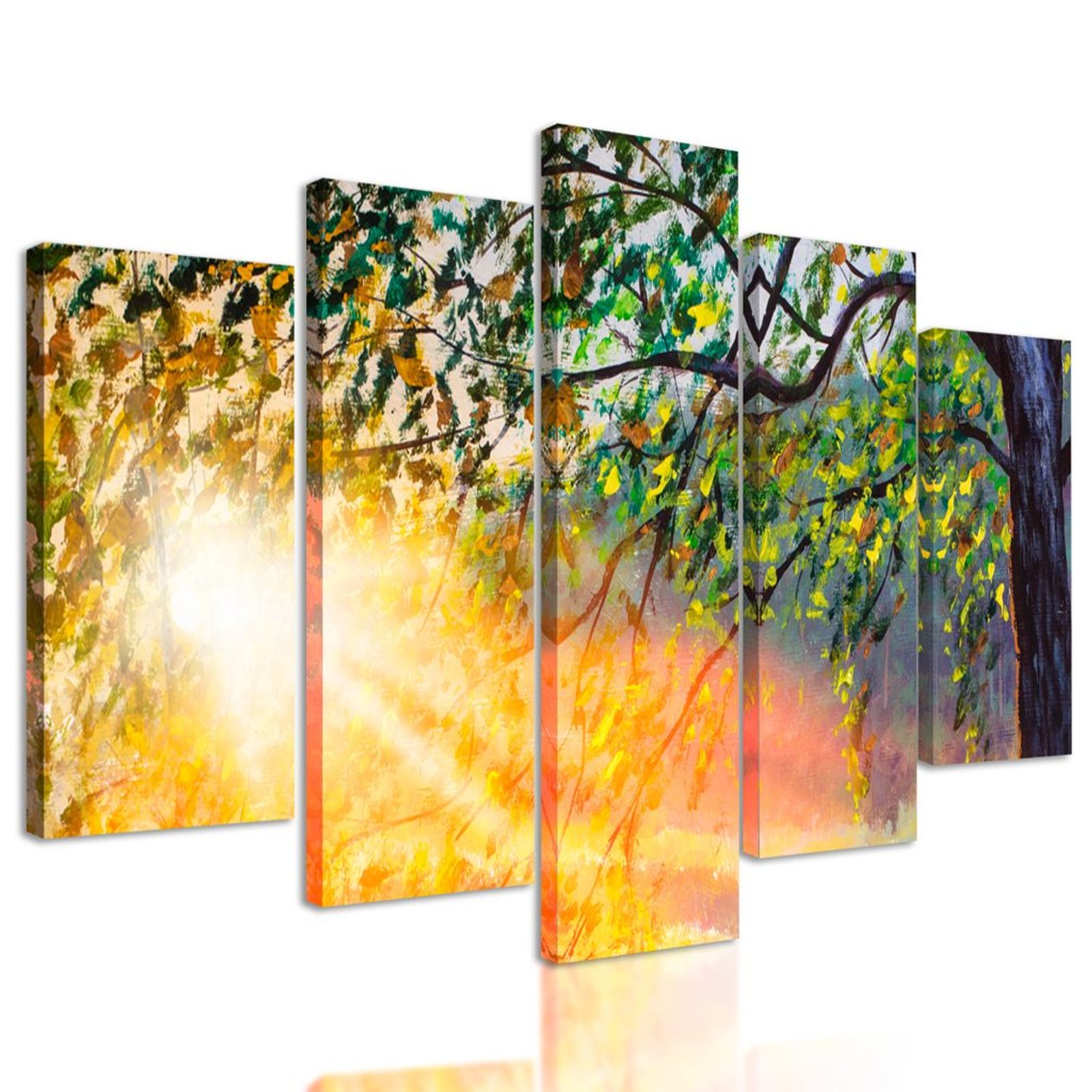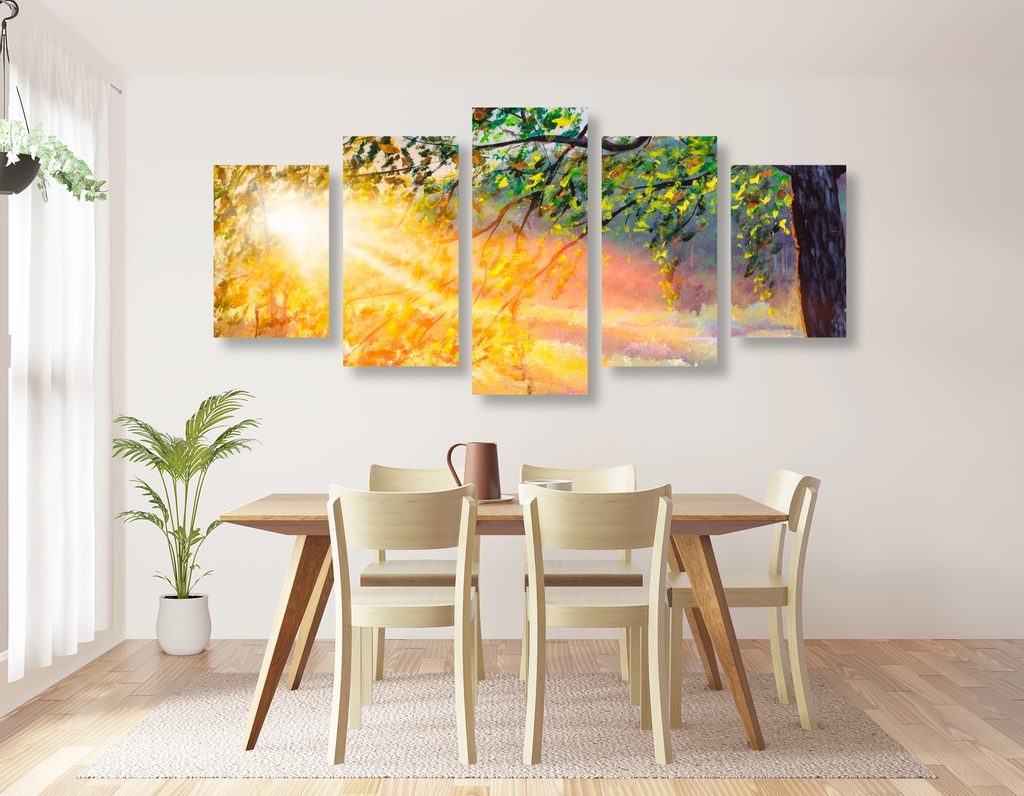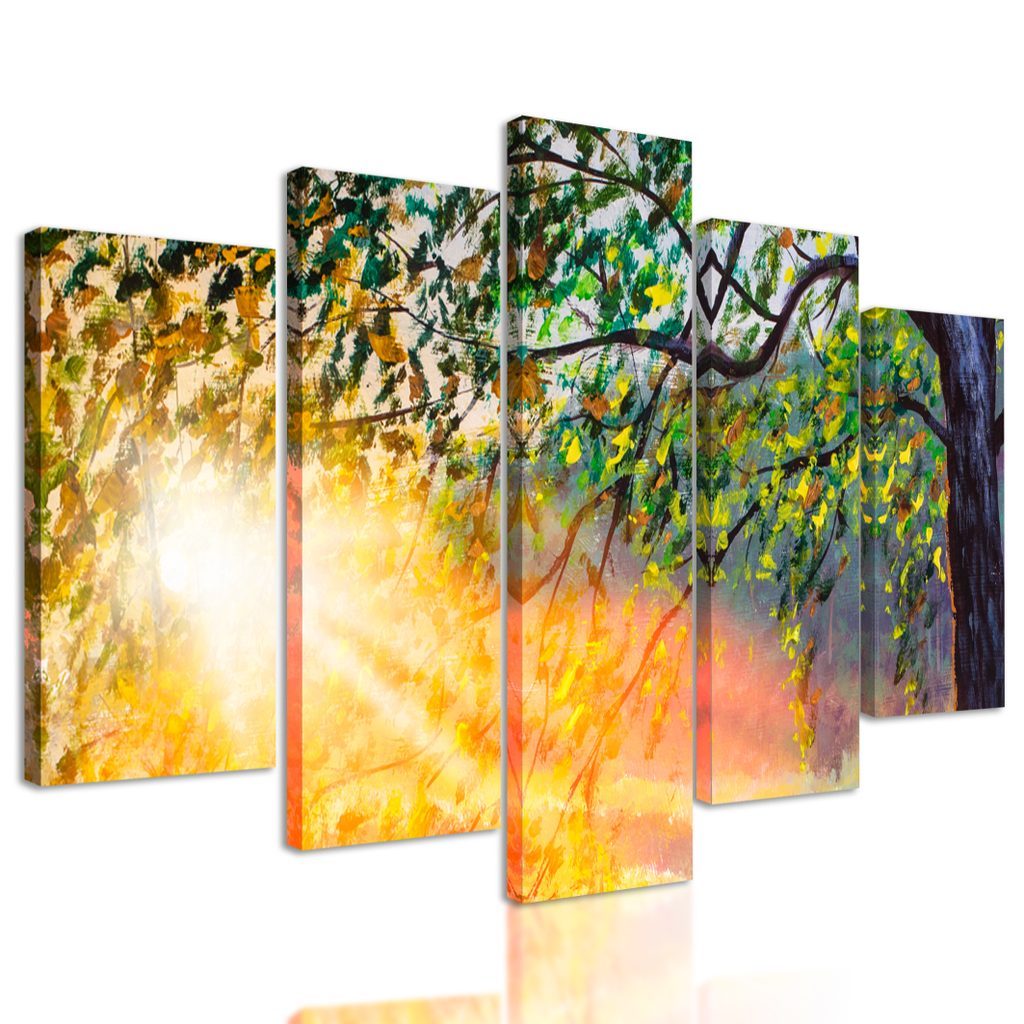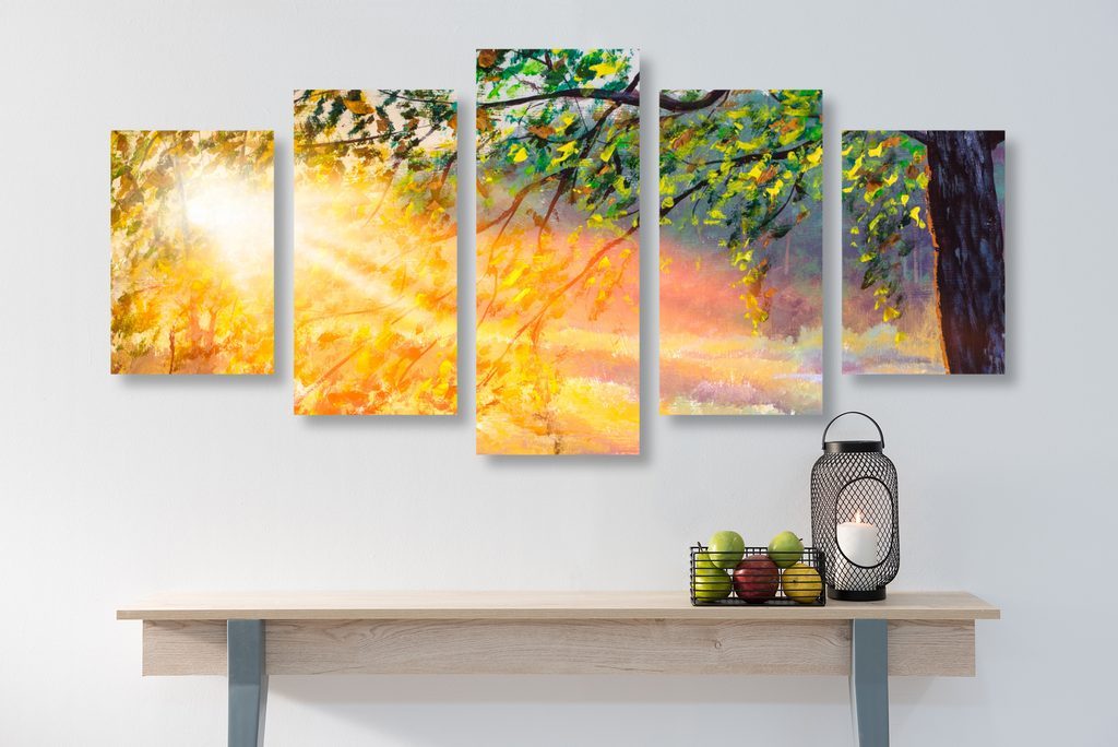 5-dílný obraz probouzející se les v paprscích slunce