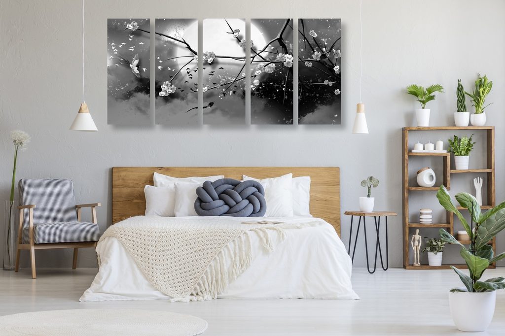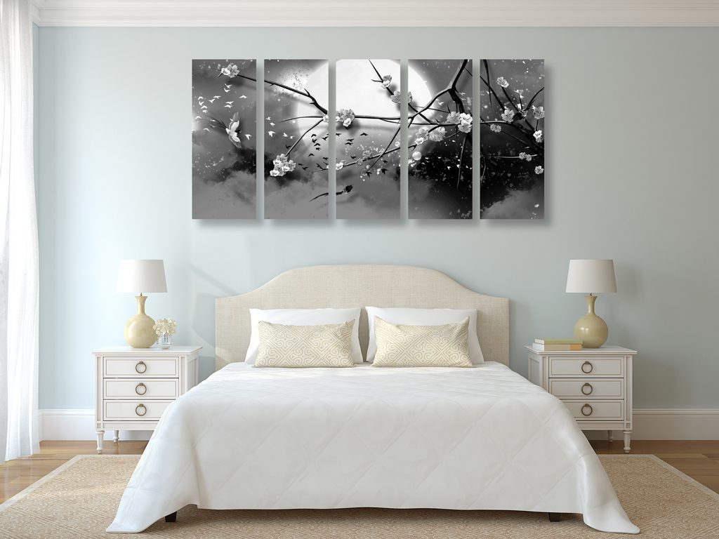 5-dílný obraz ptáčci létající za úplňku měsíce v černobílém provedení