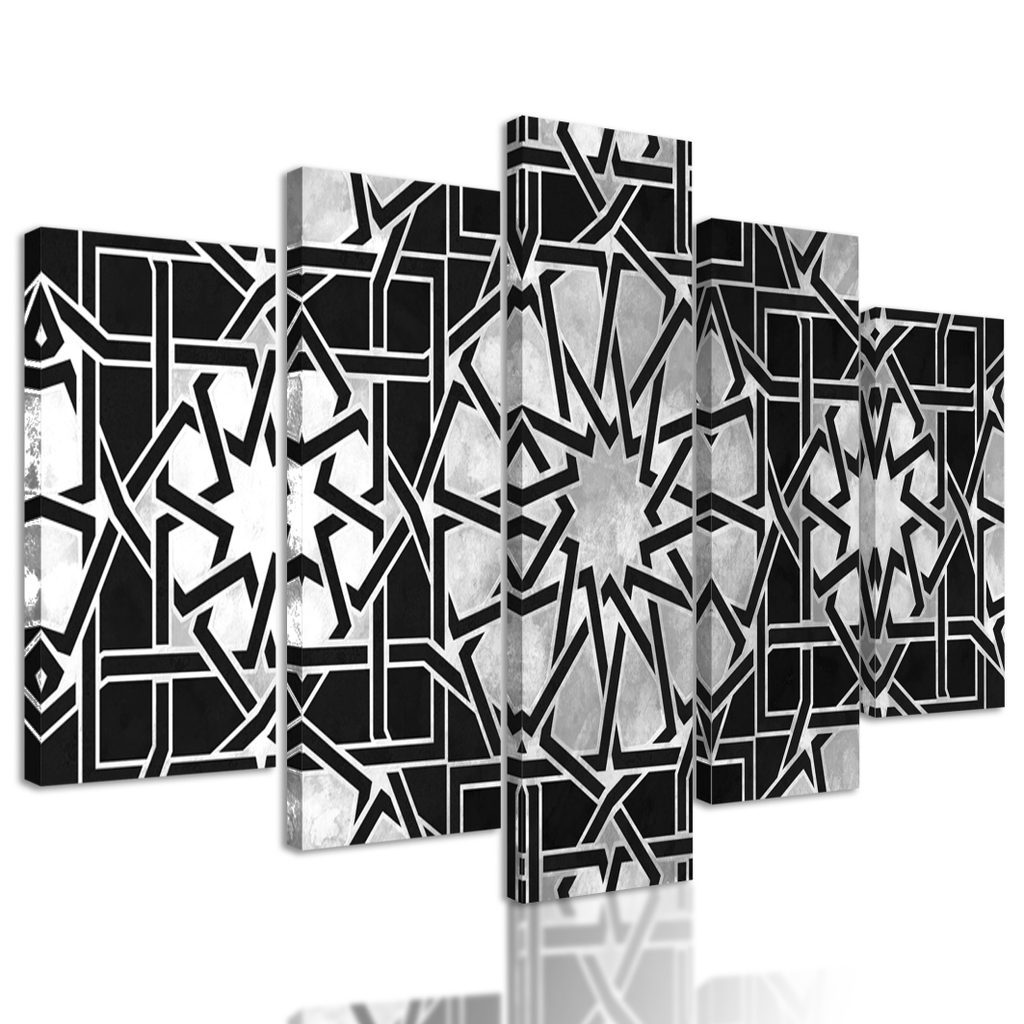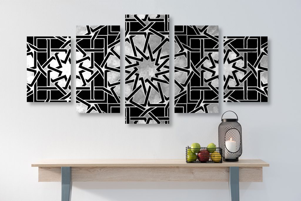 5-dílný obraz stříbrná mandala v černobílém provedení