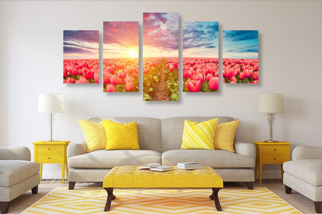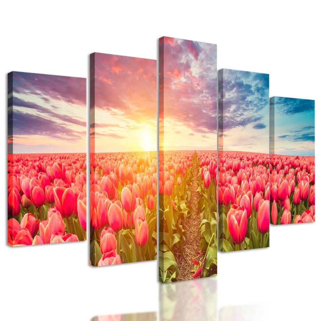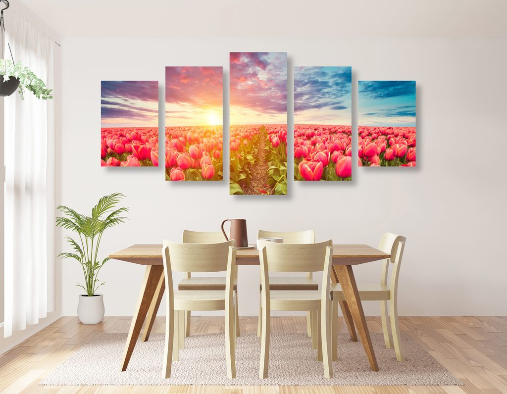 5-dílný obraz západ slunce nad rozkvinutými tulipány