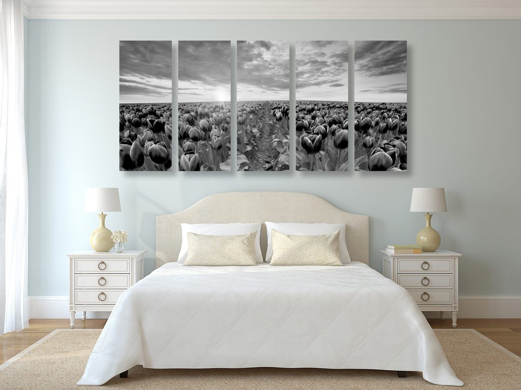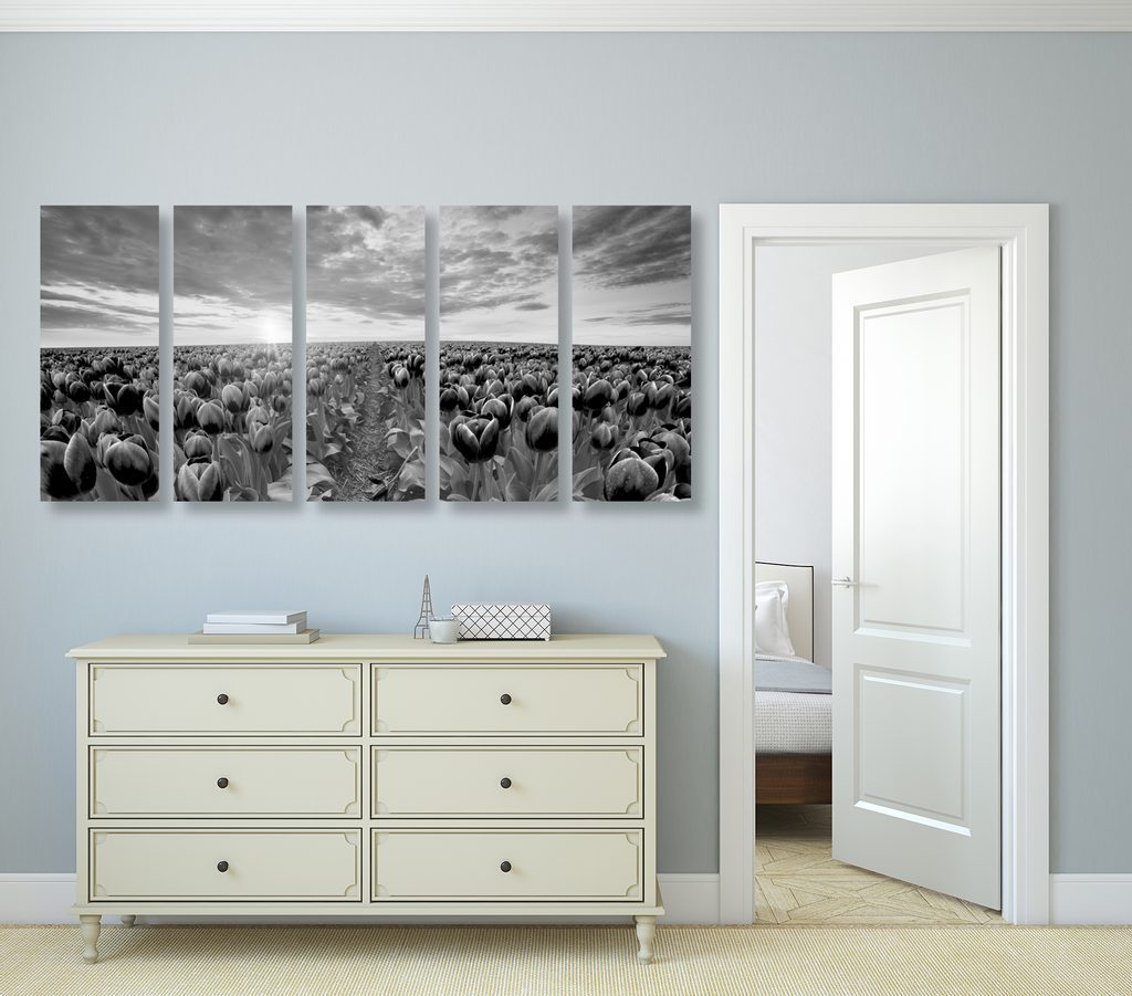 5-dílný obraz západ slunce nad rozkvinutými tulipány v černobílém provedení