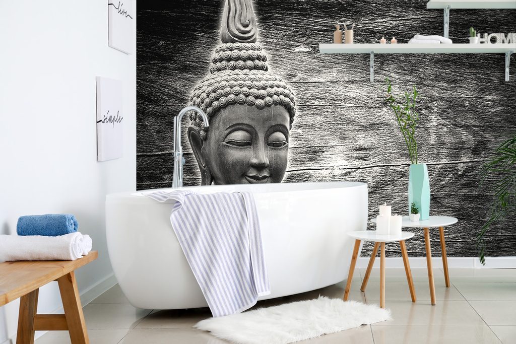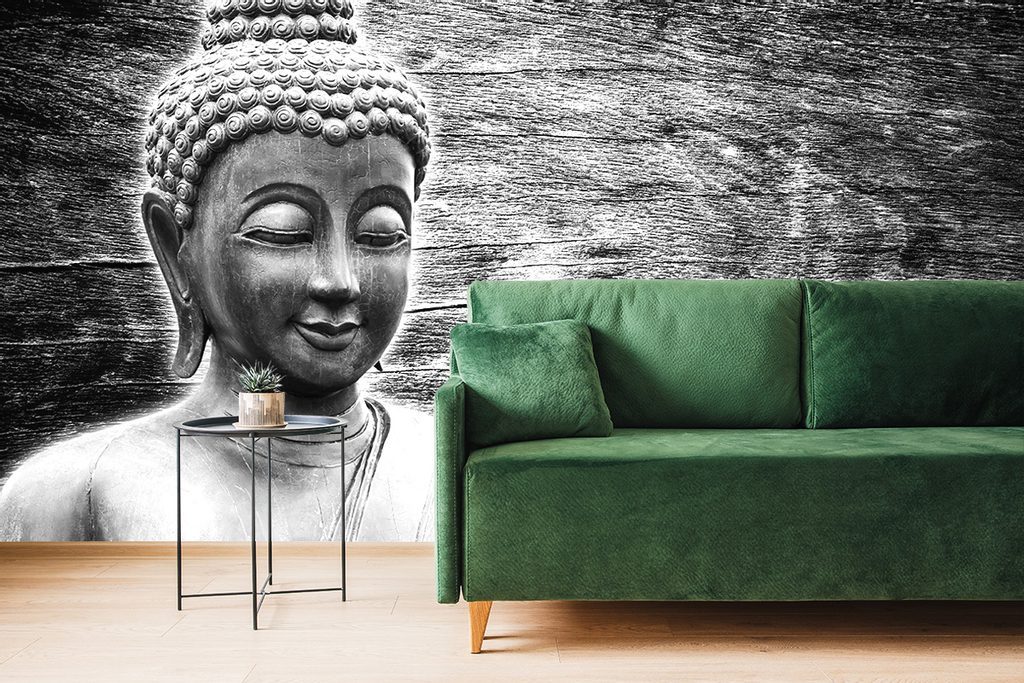 Fototapeta Buddha u dřevěného pozadí v černobílém provedení