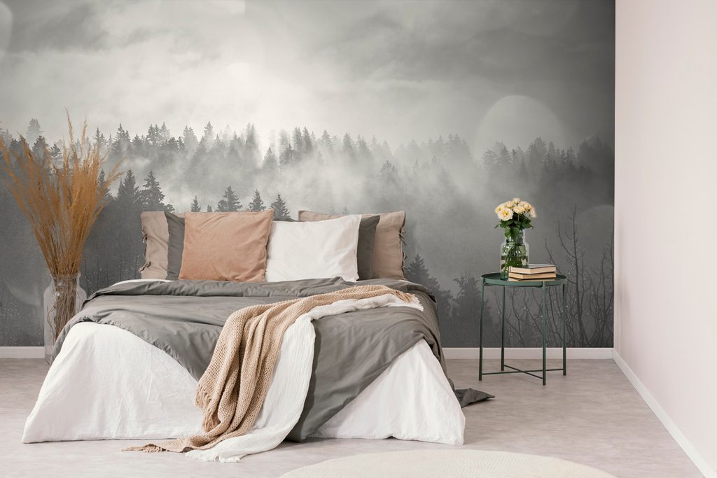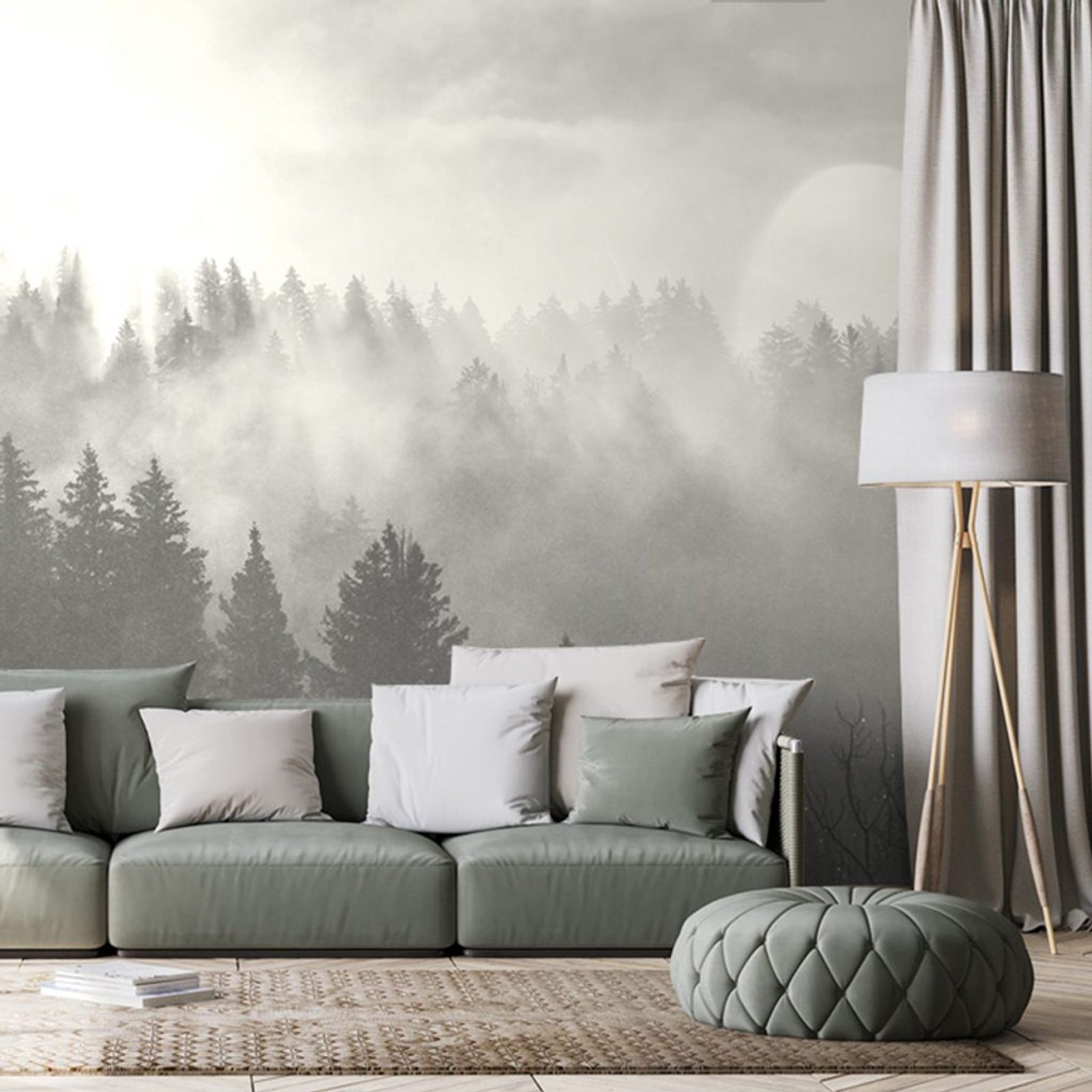 Fototapeta ranní paprsky slunce nad lesem v černobílém provedení
