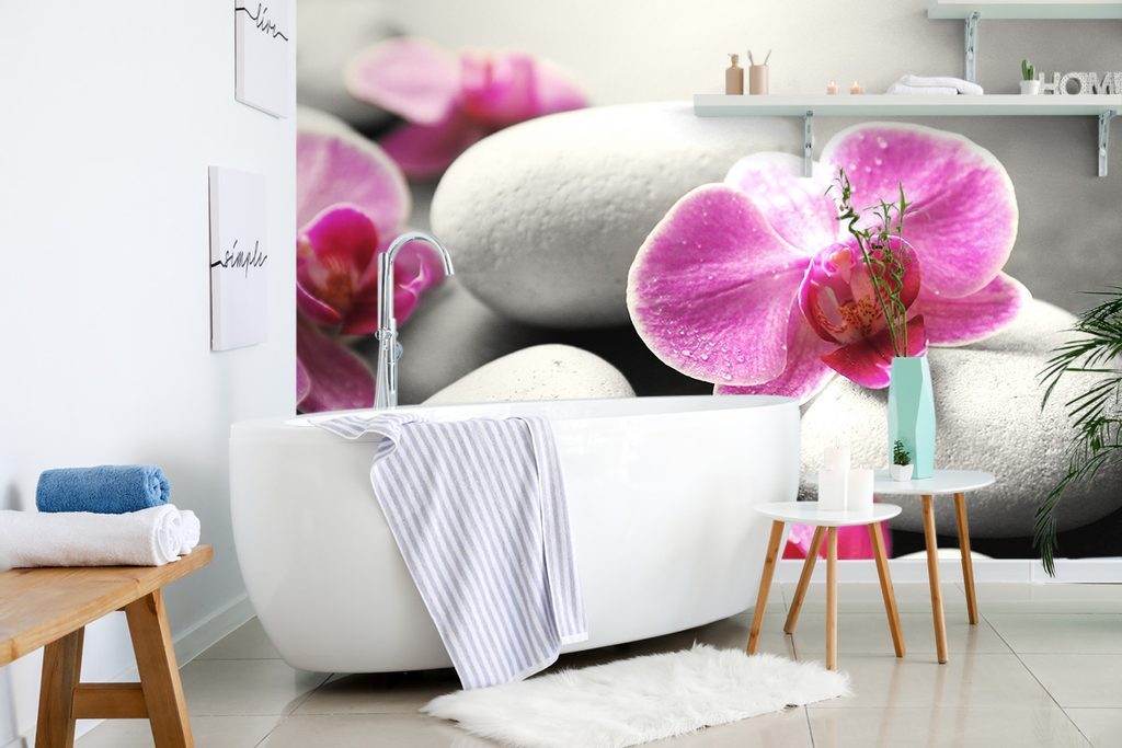 Samolepící fototapeta kompozice kamenů se žlutou orchidejí