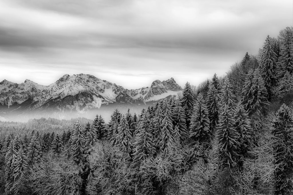 Samolepící fototapeta zasněžené pohoří v černobílém provedení