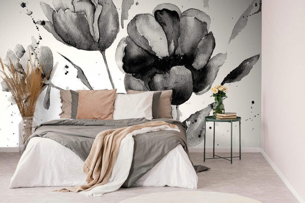 Samolepící tapeta malovaná kytice v černobílém provedení
