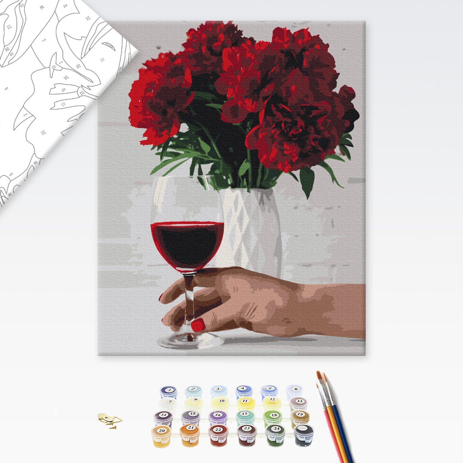 Malování podle čísel sklenka vína a váza pivoněk
