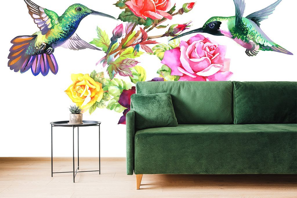Nádherná samolepící tapeta létající kolibříci u květin