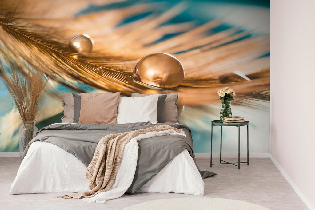 Nádherná samolepící tapeta zlaté pírko s kapkou vody