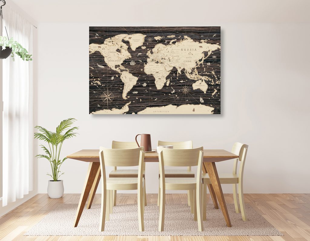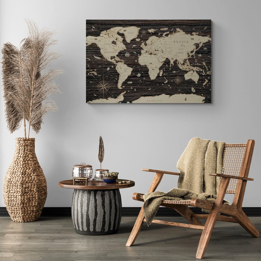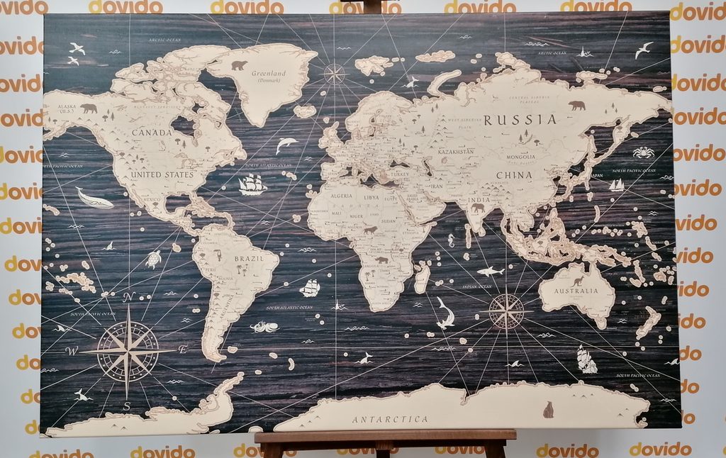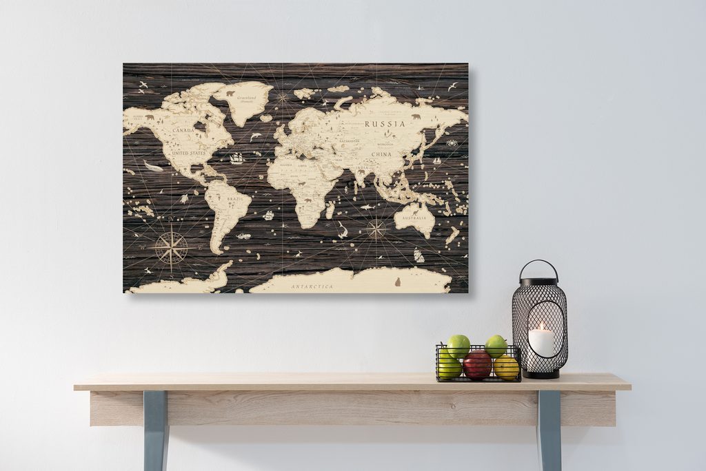 Obraz moderní mapa světa na dřevěném podkladu v černobílém provedení