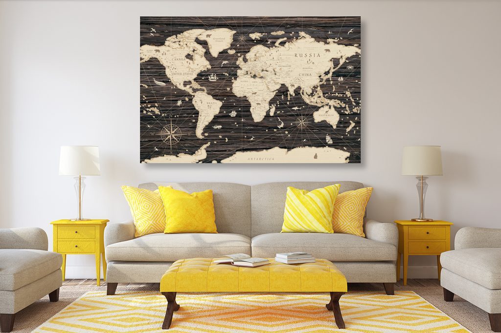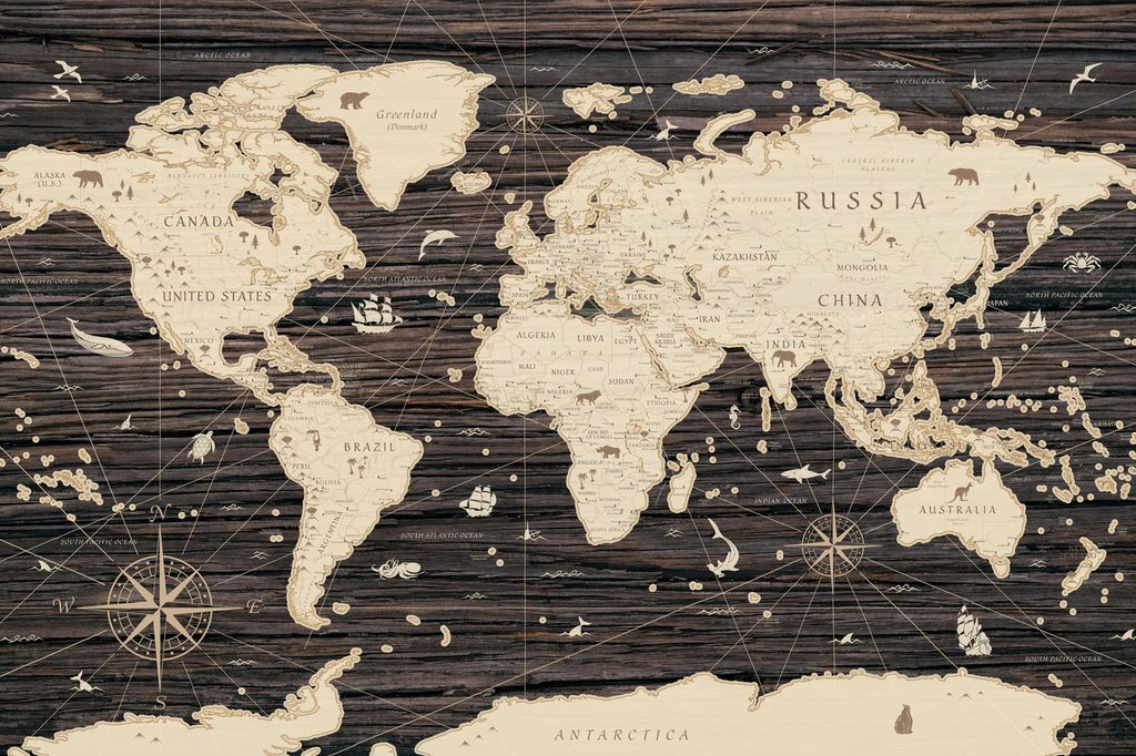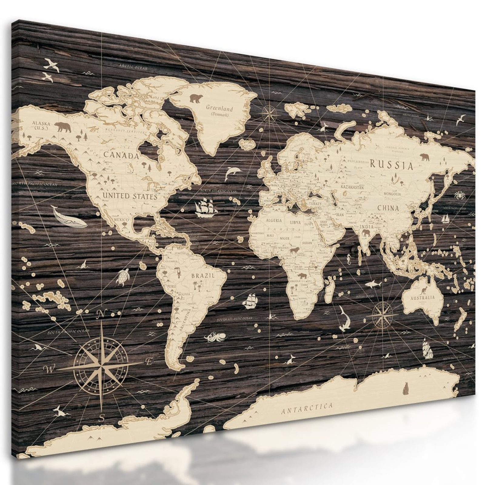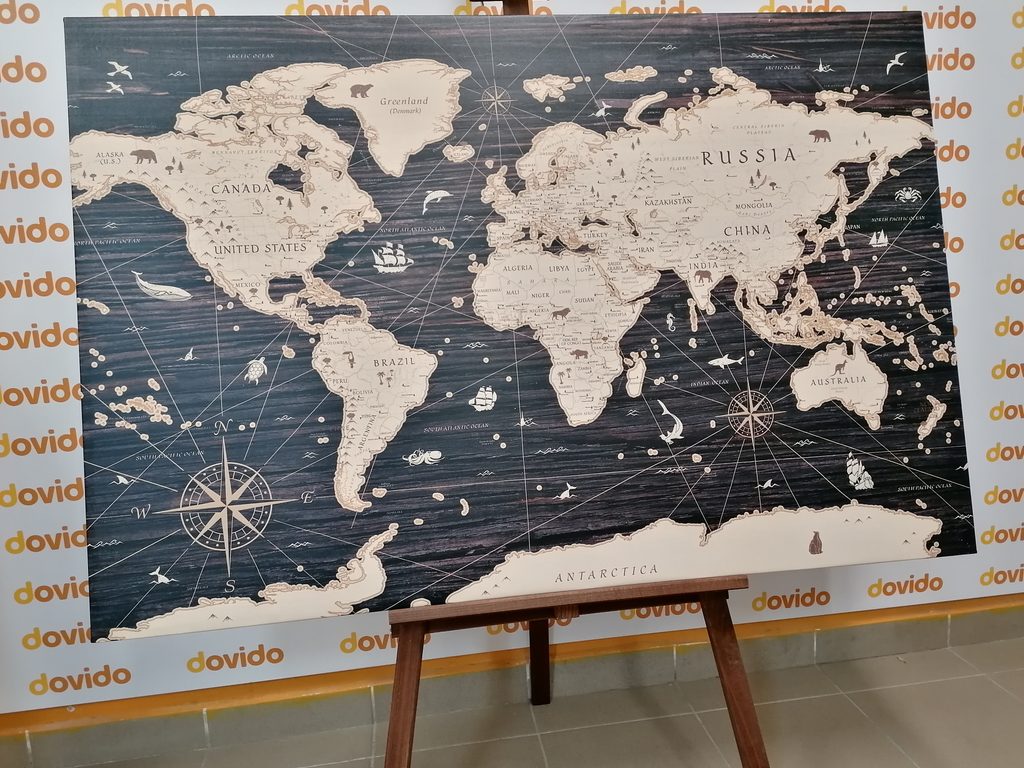 Obraz moderní mapa světa na dřevěném podkladu v černobílém provedení