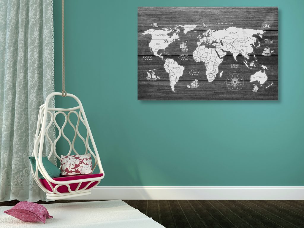 Obraz na korku černobílá mapa světa s dřevěným pozadím