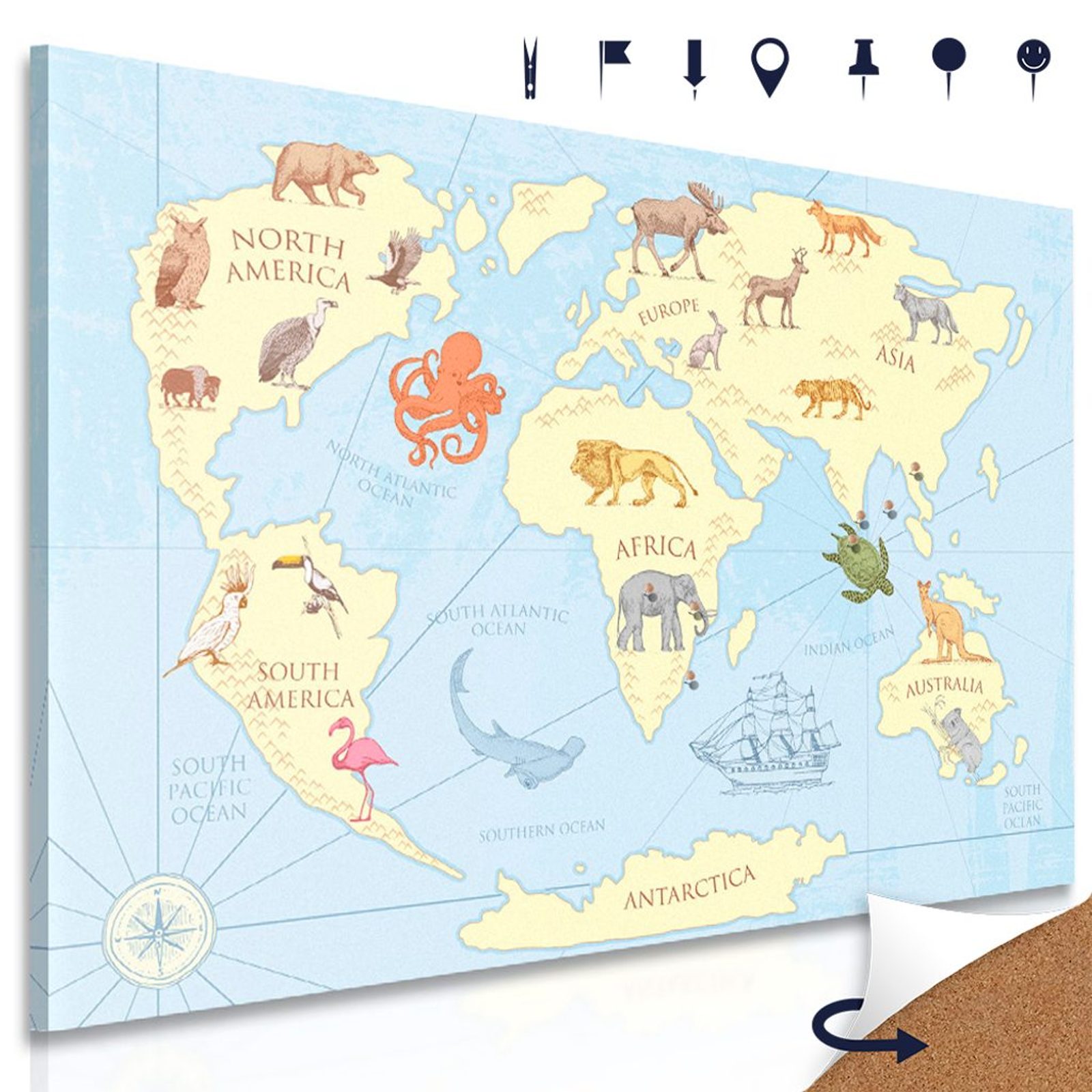 Obraz na korku mapa světa s charakteristickými zvířaty