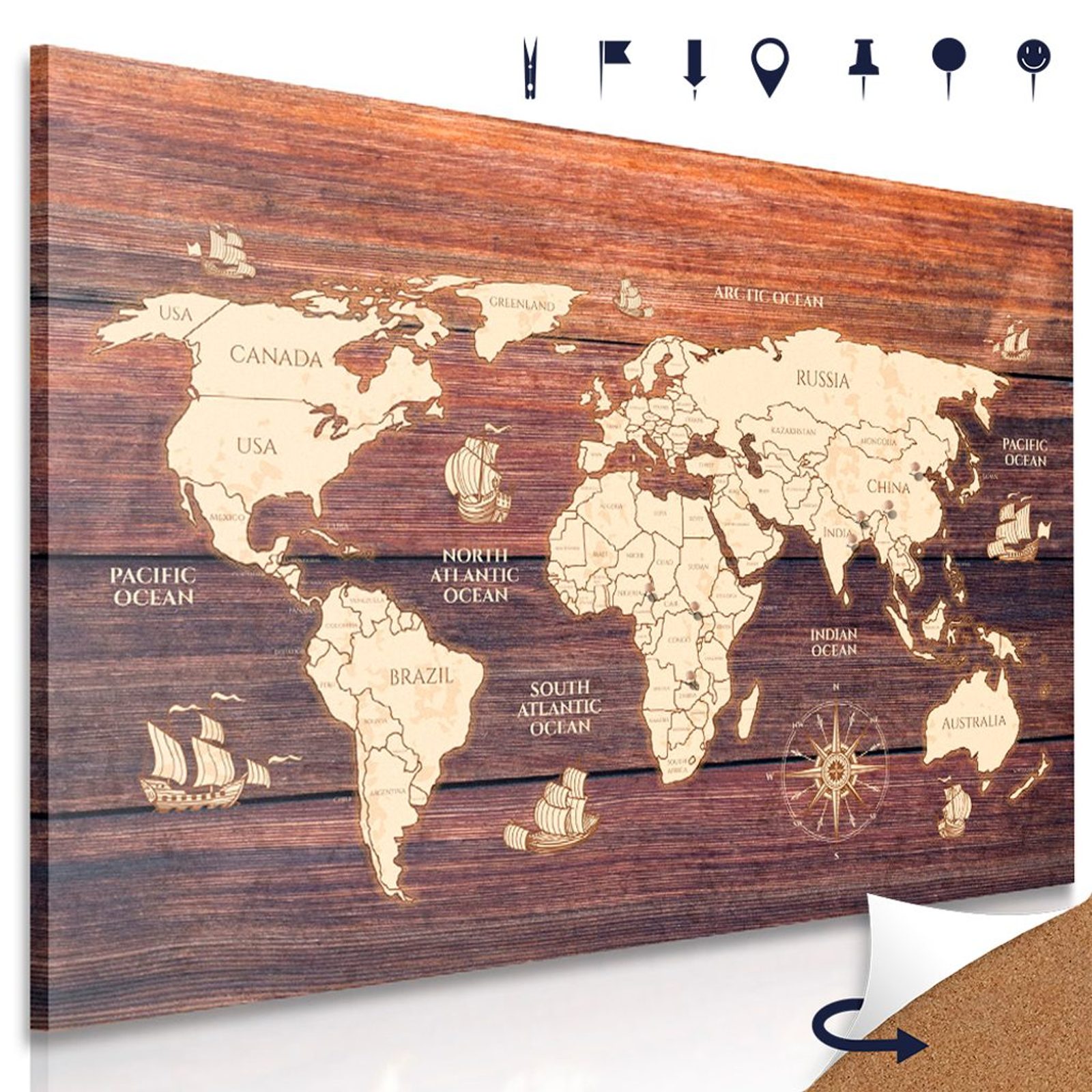 Výhody USP mapy na korku Snadná instalace, Korková deska tlustá až 3 mm, Rozmanité využití produktu - vhodné i jako dárek, Součástí obrazu je 10 ks připínáčků dle vlastního výběru