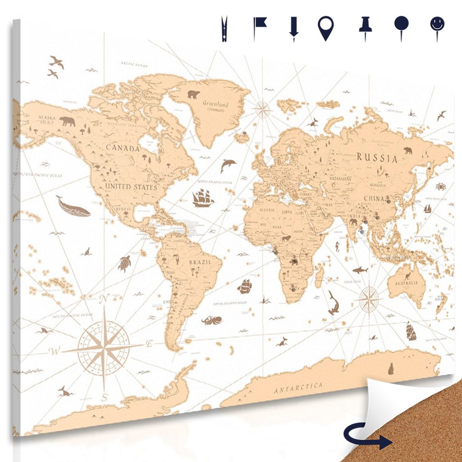 Výhody USP mapy na korku Snadná instalace, Korková deska tlustá až 3 mm, Rozmanité využití produktu - vhodné i jako dárek, Součástí obrazu je 10 ks připínáčků dle vlastního výběru