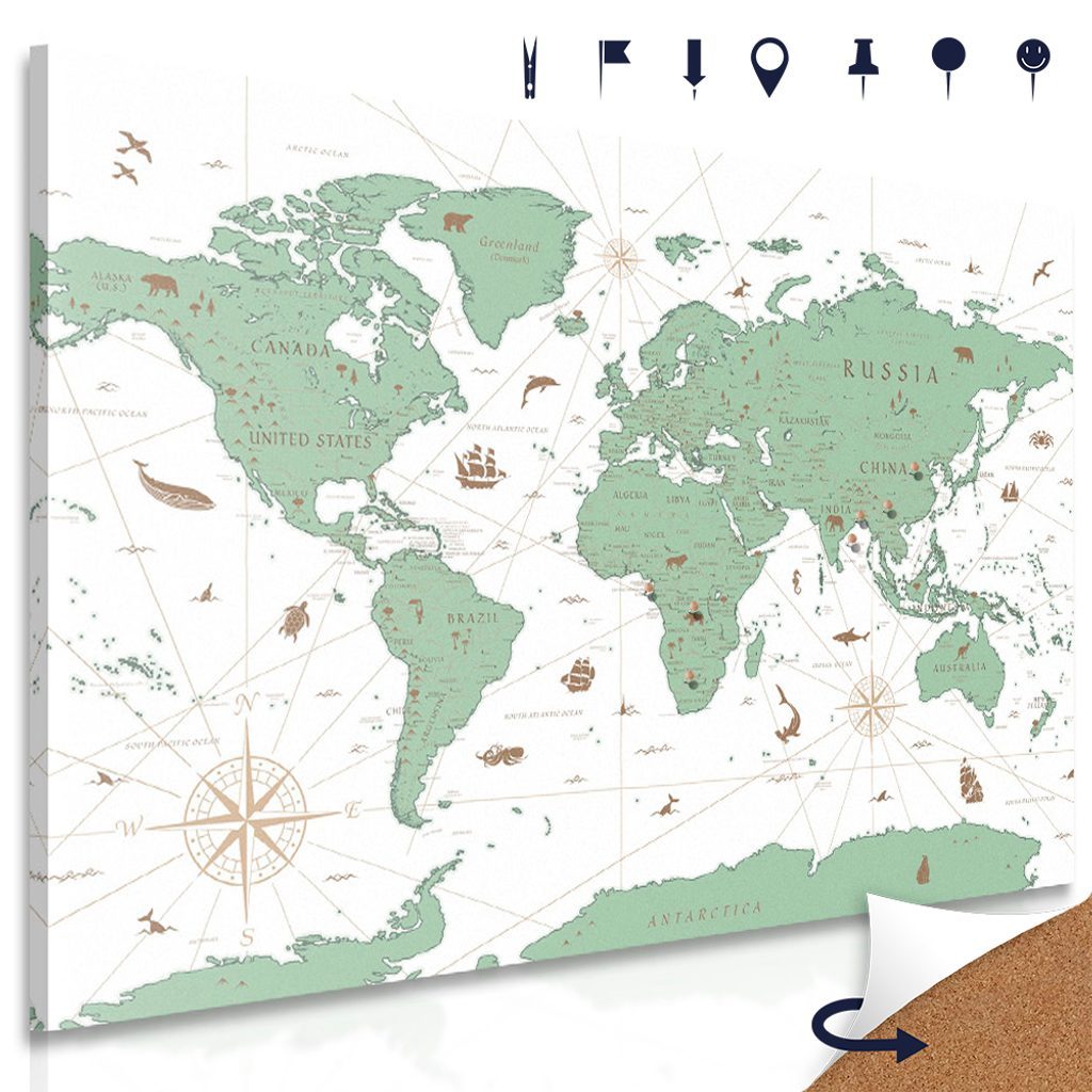 Obraz na korku mapa světa s historickým nádechem v zeleném provedení