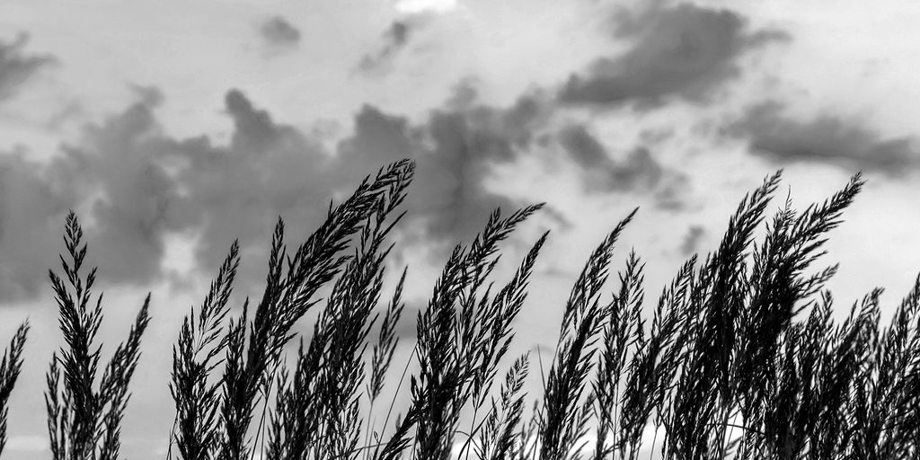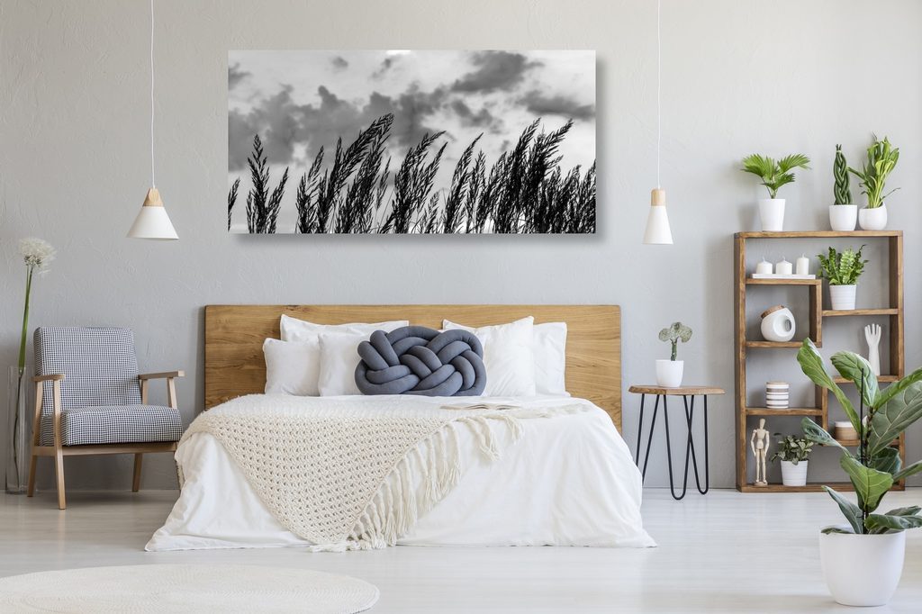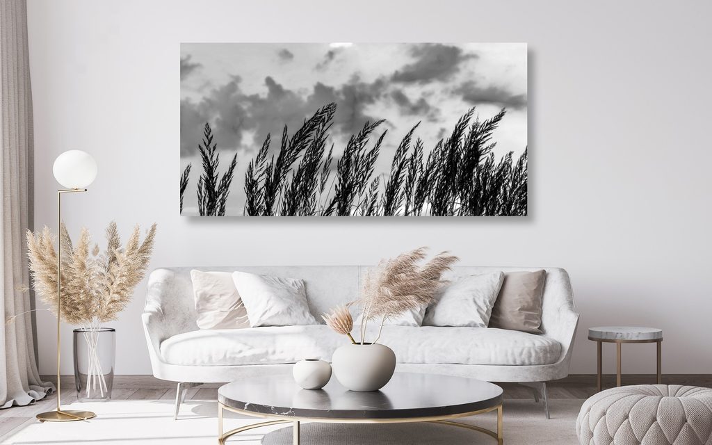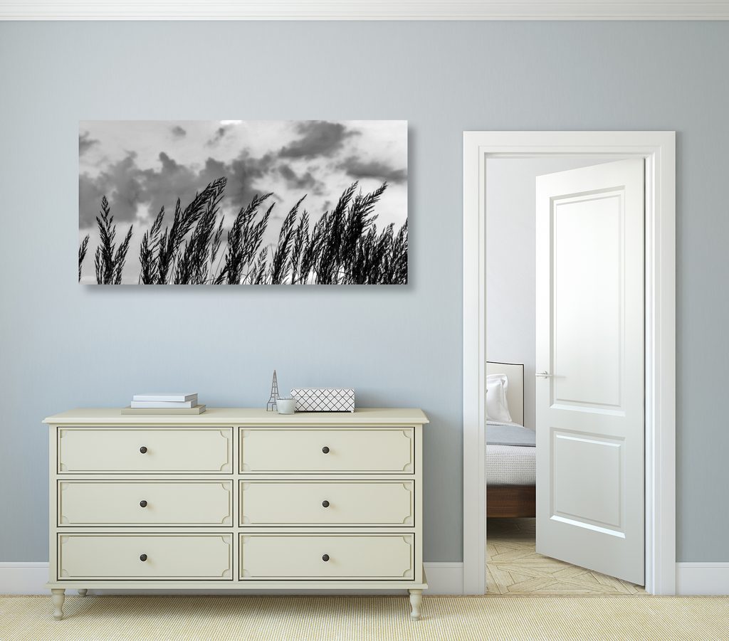 Obraz polní tráva s nebeským pozadím v černobílém provedení