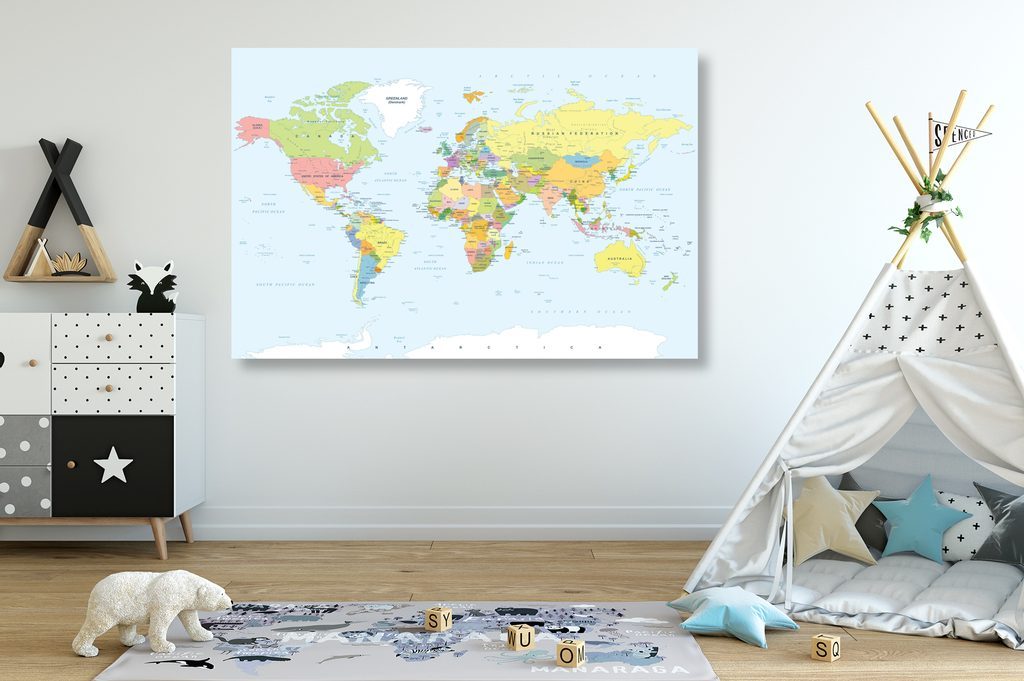 Obraz na korku černobílá moderní mapa světa na dřevěném podkladu