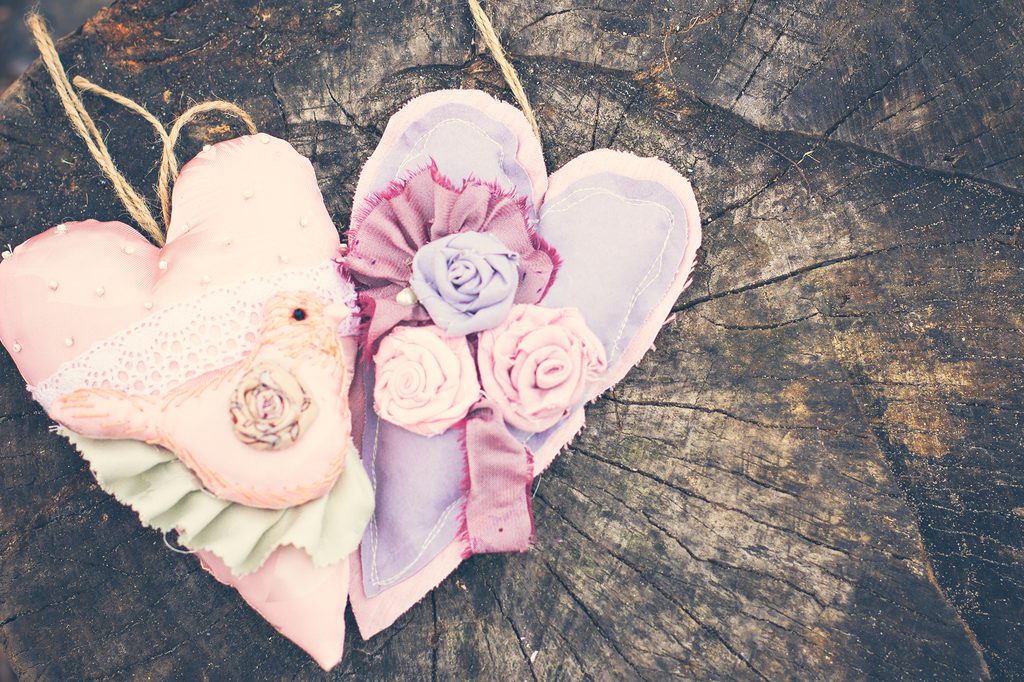 Obraz vyšívaná srdíčka a ptáček na pníku