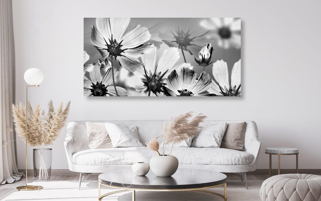 Obraz rozkvetlá louka v černobílém provedení
