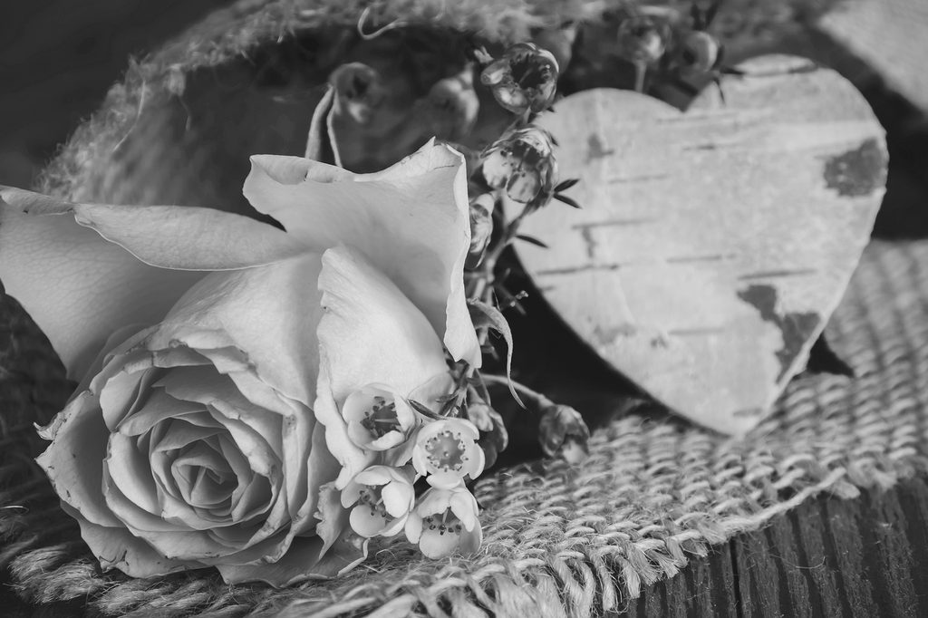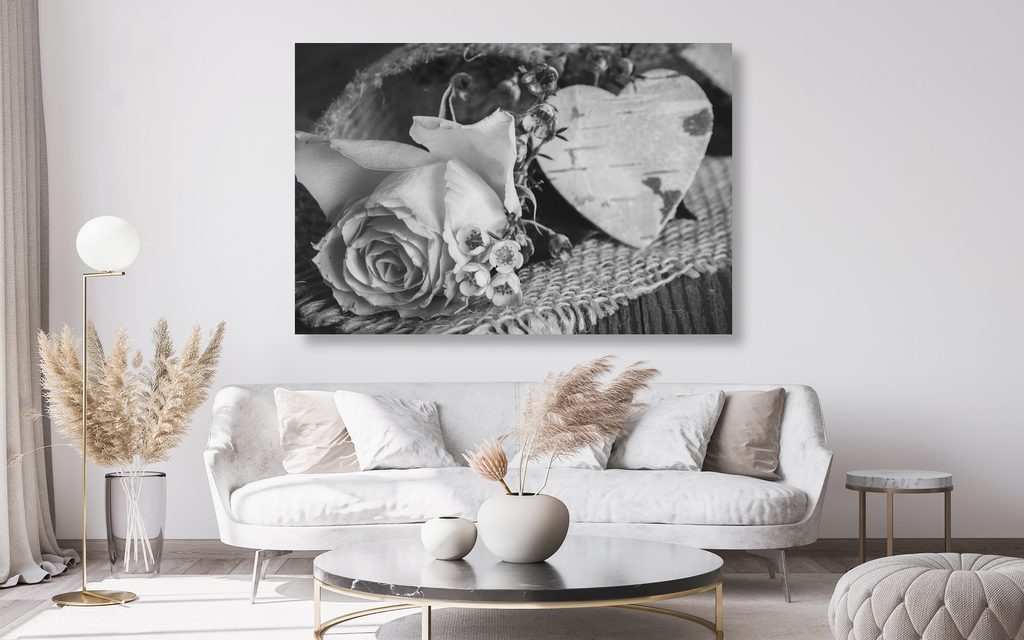 Obraz zátiší s růží a srdíčkem v černobílém provedení