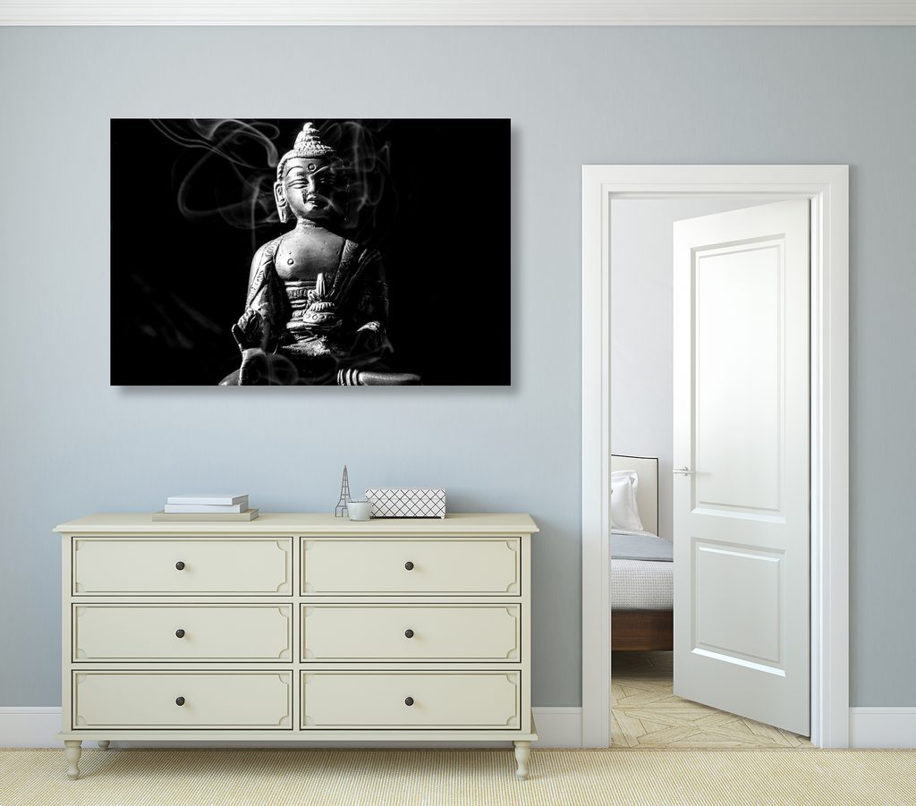 Obrazu Buddha zahalený kouřem v černobílém provedení