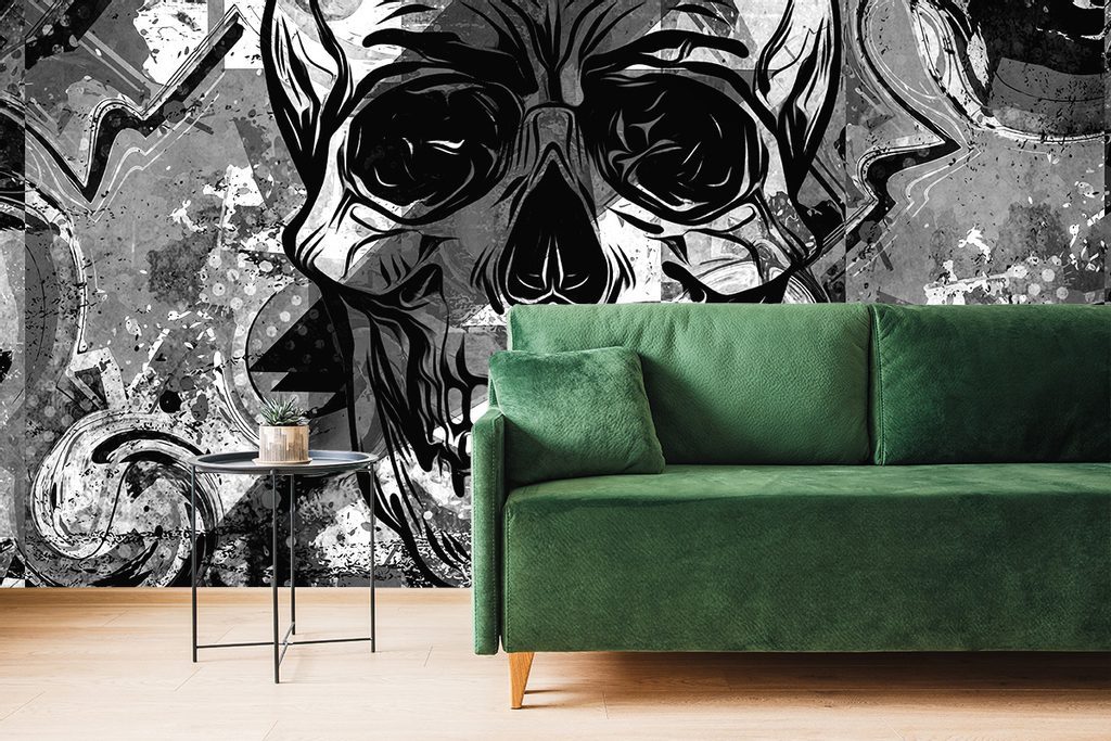 Originální černobílá samolepící tapeta lebka v graffiti stylu