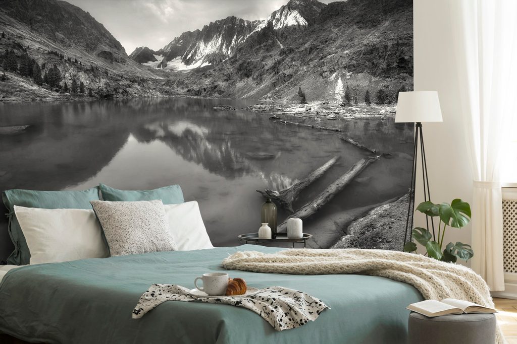 Originální samolepící fototapeta černobílé jezero uprostřed hor