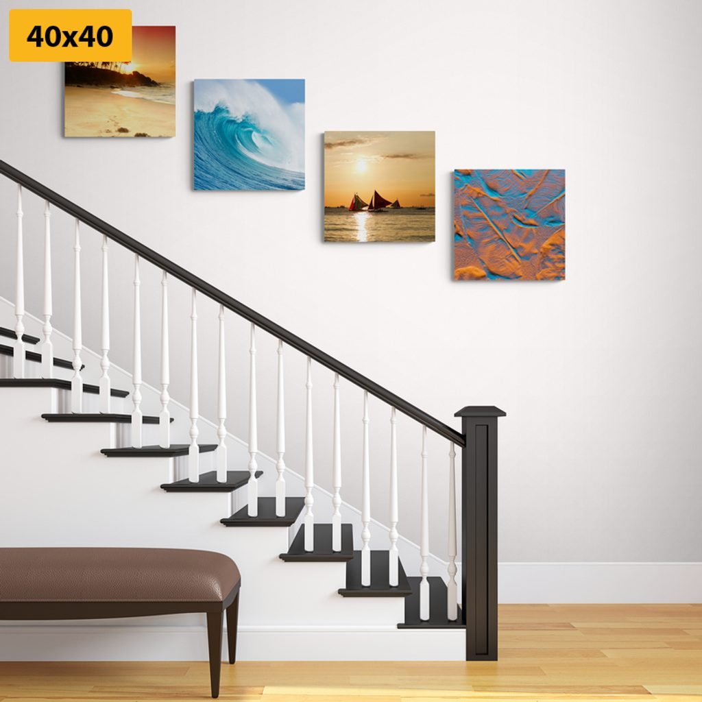 Výhody USP sety Čtyři obrazy laděné do podobných motivů a barev, Snadná instalace, Možnost umístění dle vlastních představ, Prémiové plátno 280 g/m²