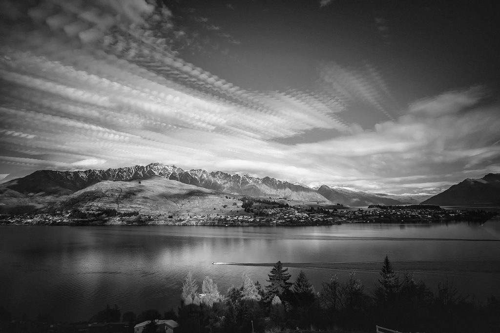 Samolepící fototapeta černobílá vesnice na úpatí hor