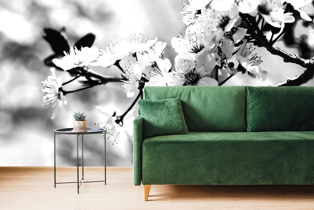 Samolepící fototapeta černobílé kvítky třešně