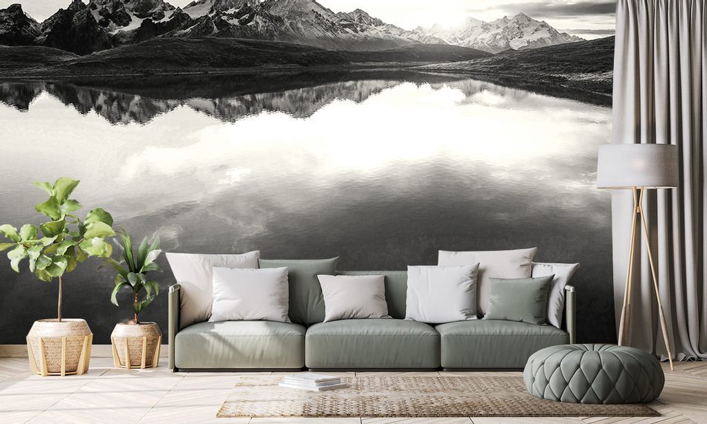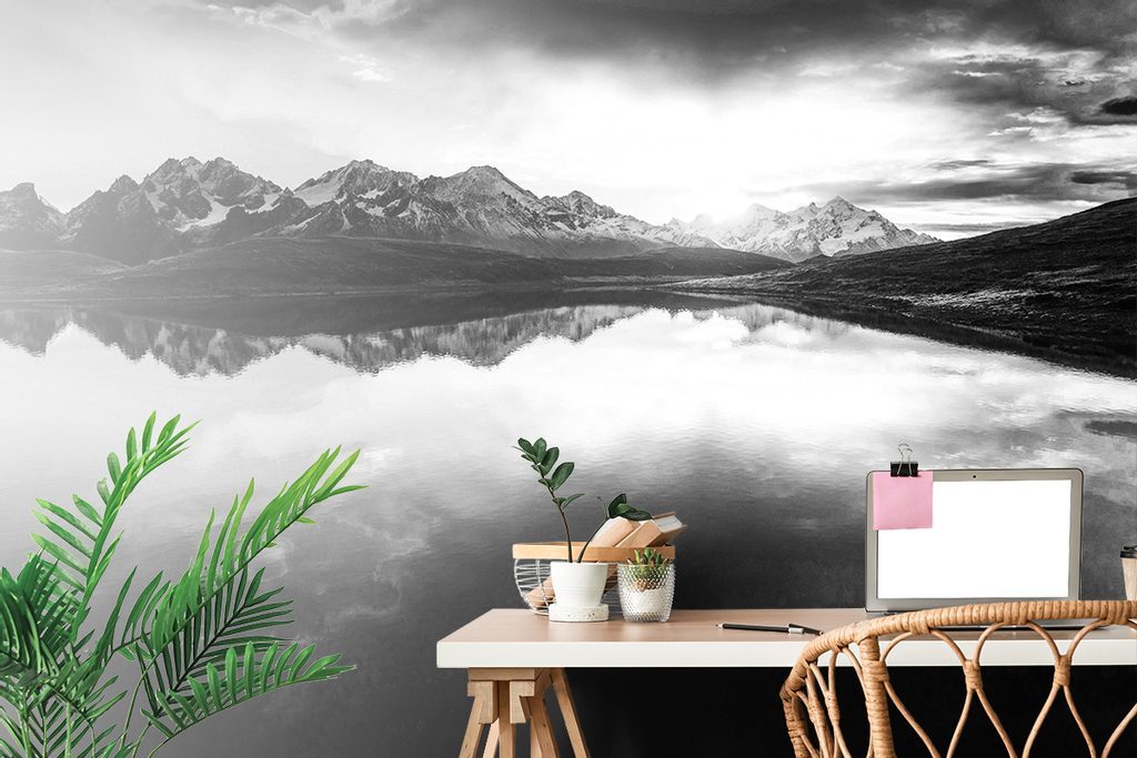 Samolepící fototapeta černobílý odraz západu slunce v horském jezeře