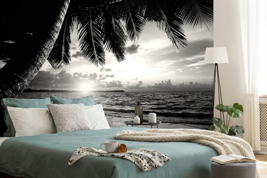 Samolepící fototapeta černobílý východ slunce na pláži v Karibiku