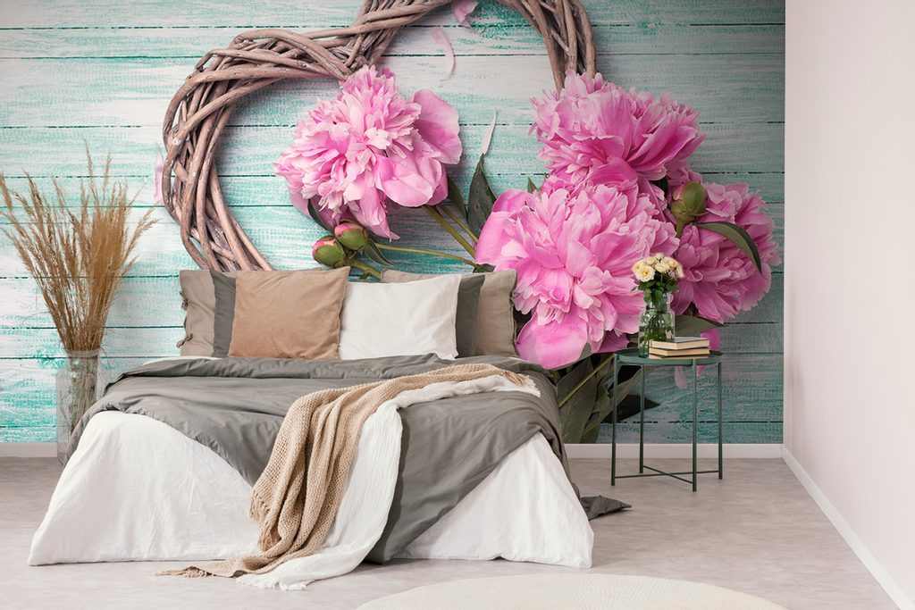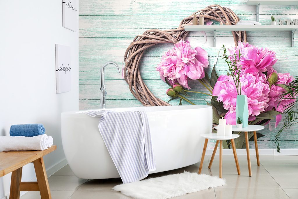 Samolepící fototapeta dřevěné srdce s pivoniemi
