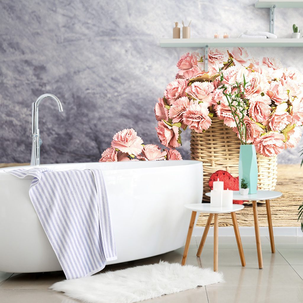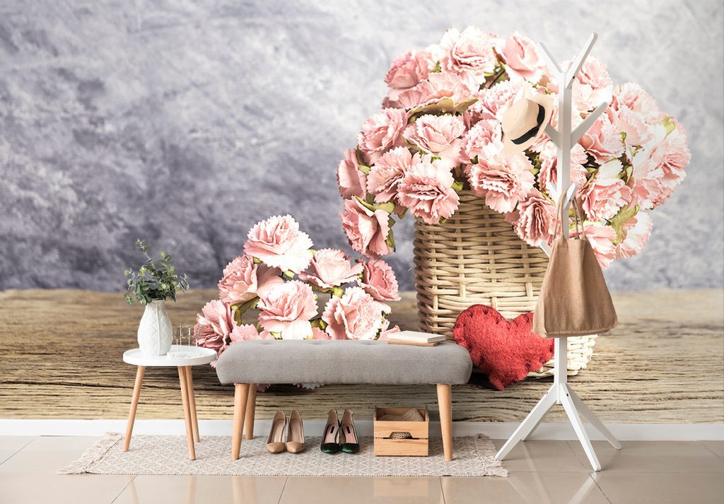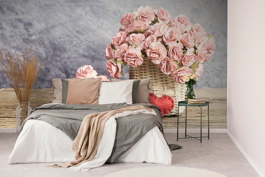 Samolepící fototapeta košík s elegantními růžovými karafiáty