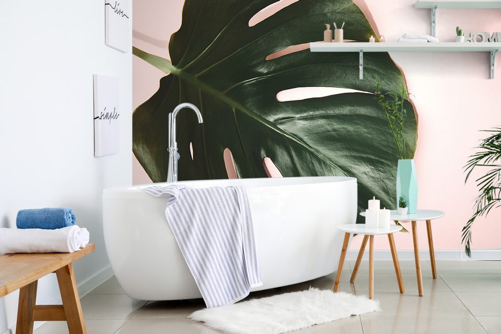 Samolepící fototapeta list monstery na růžovém pozadí
