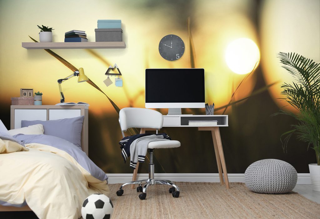 Samolepící fototapeta pohled na západ slunce z trávy