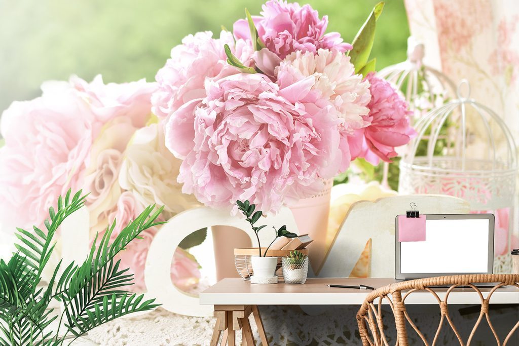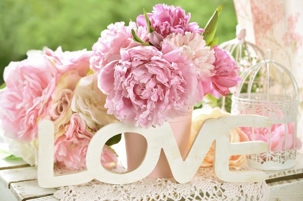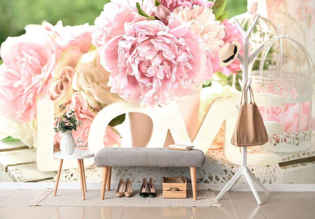 Samolepící fototapeta zátiší s pivoniemi a nápisem Love