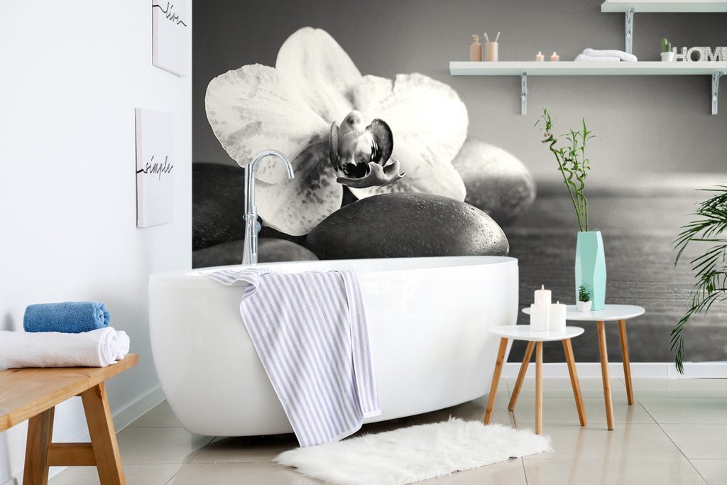 Samolepící fototapeta zen kameny s orchidejí v černobílém provedení