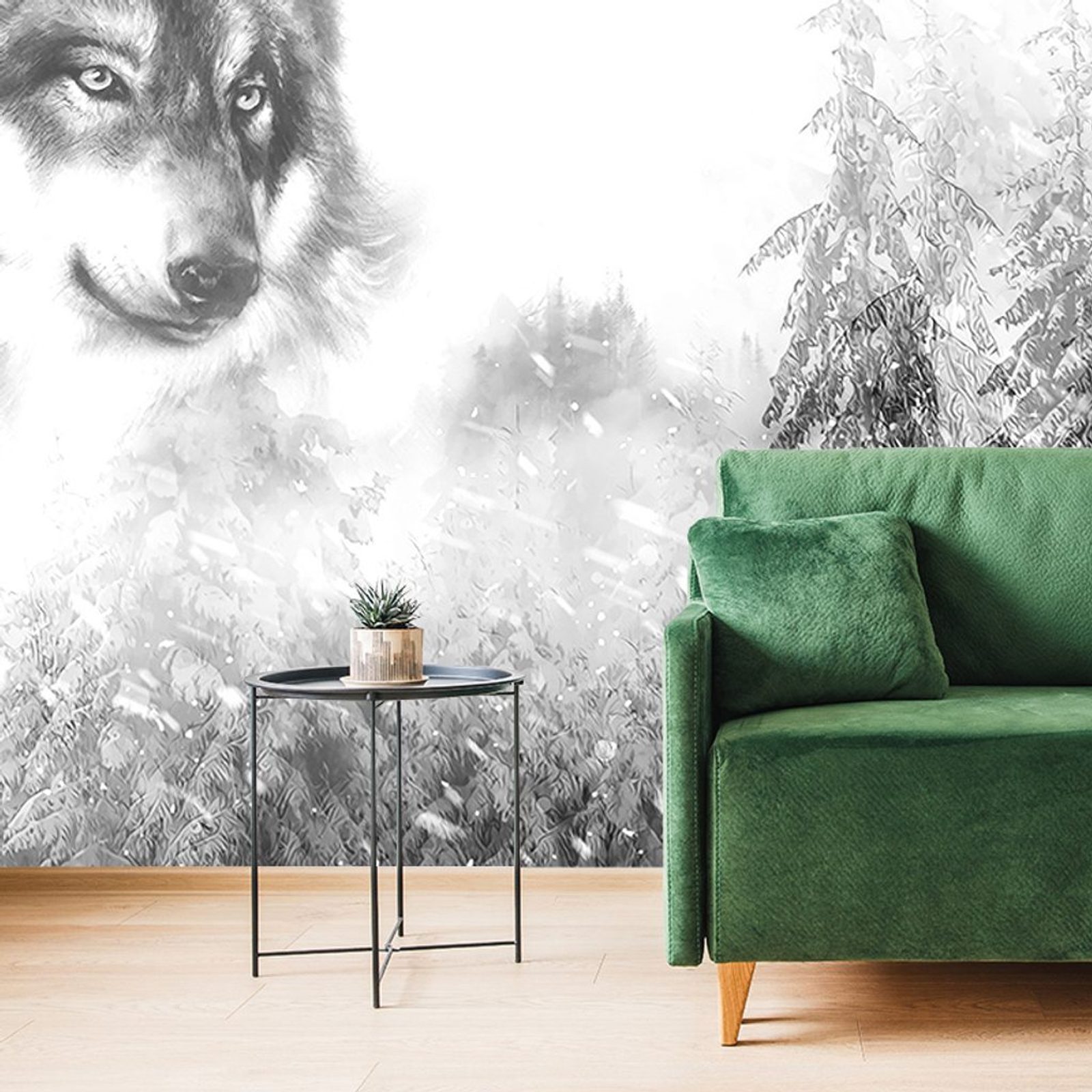 Samolepící tapeta černobílá malba vlka v zimní přírodě
