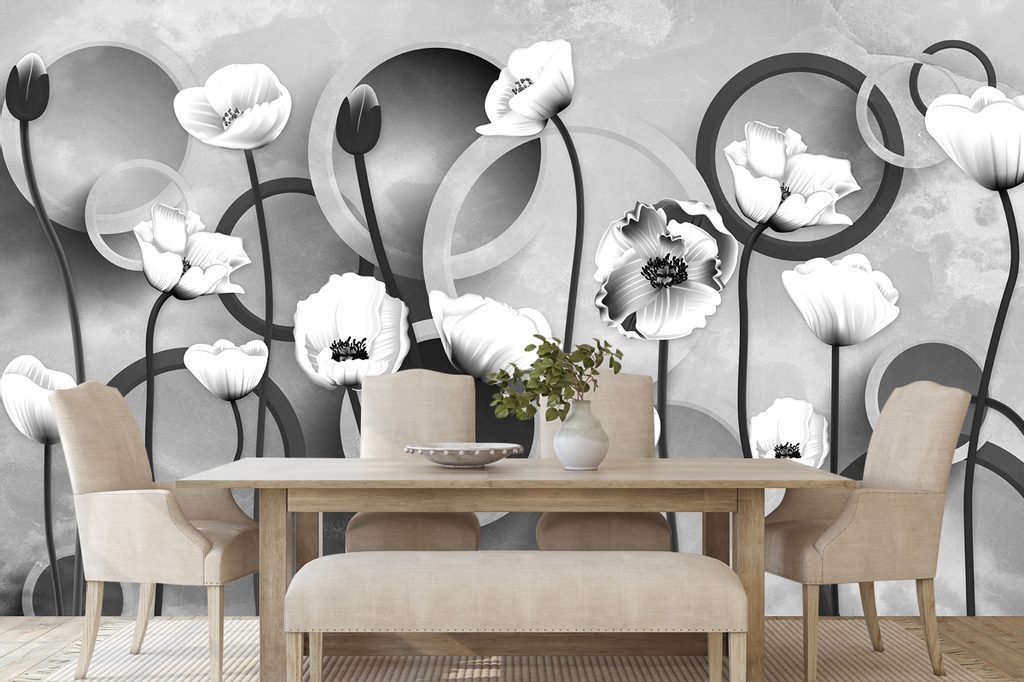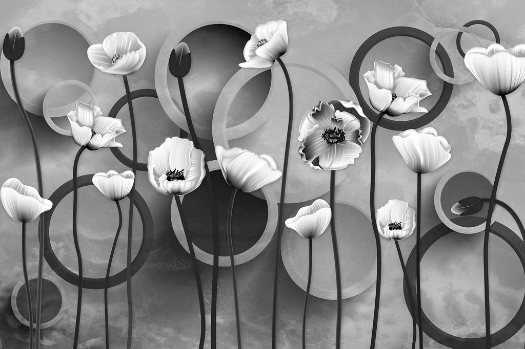 Samolepící tapeta černobílé květy máku s abstraktním pozadím