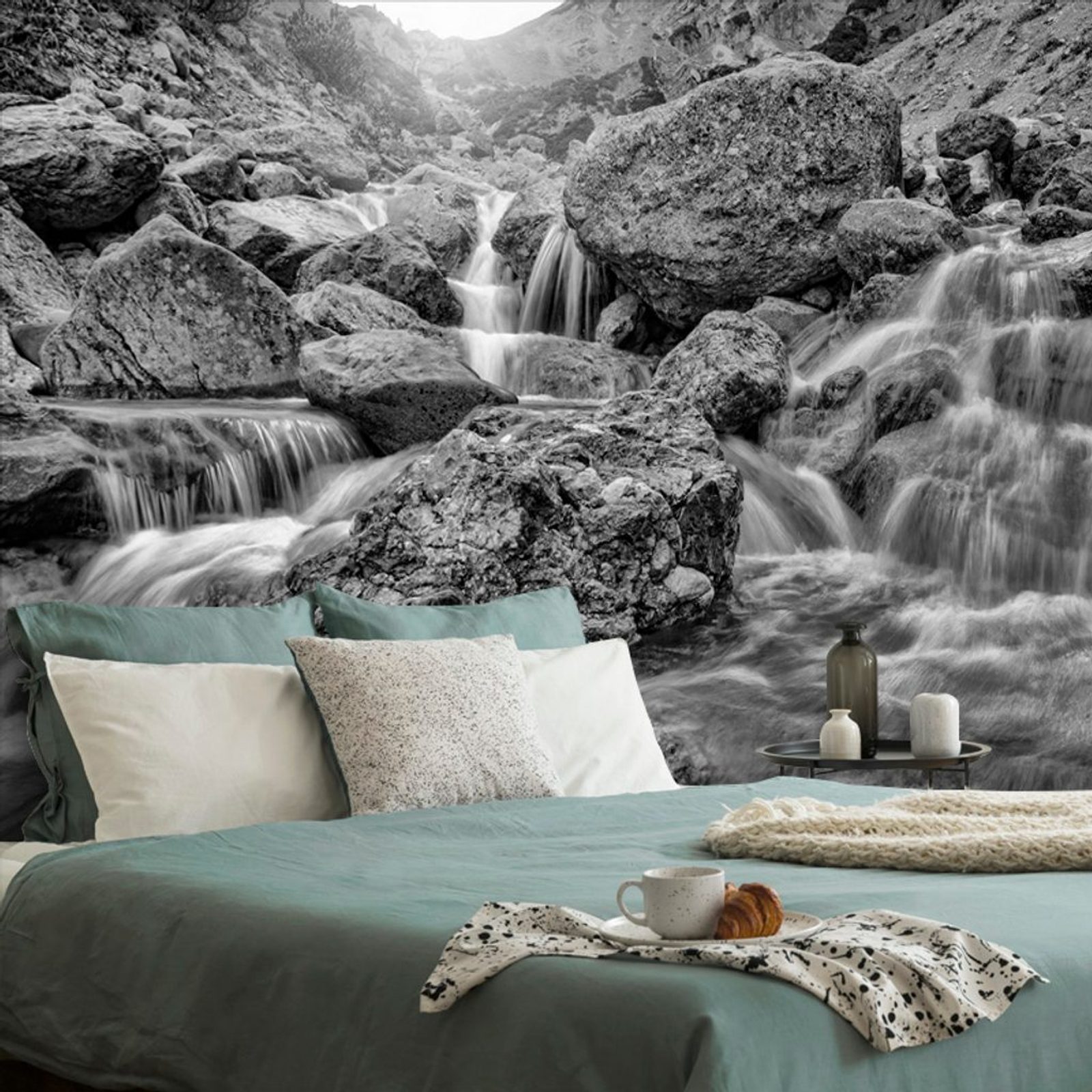 Samolepící tapeta černobílé vodopády uprostřed hor